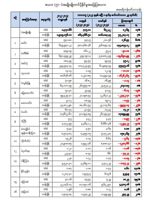 ထို့အတူ ပဲစင်းငုံတန်ချိန် ၁၀၇,၄၂၄ တန်ကျော်တင်ပို့မှုမှ ဝင်ငွေဒေါ်လာ ၉၄ သန်းကျော်ရရှိခဲ့ပြီး ယခင်နှစ်ထက် တန်ချိန် ၄၅,၀၀ ကျော် ပိုမိုတင်ပို့နိုင်ခဲ့သဖြင့် ဝင်ငွေဒေါ်လာ ၄၅ သန်းကျော် ပိုမိုရရှိခဲ့သည်။ ကာလတူနှိုင်းယှဉ်ချက်အရ ရာခိုင်နှုန်း ၇၀ ကျော် ပိုမိုတင်ပို့နိုင်ခဲ့သည်။