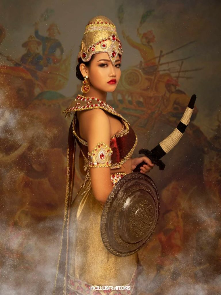 Miss Tourism Myanmar 2023 အလှမယ် ခီဆာခင်ဟာ အသက် ၁၆ နှစ်အရွယ်ဆိုပေမယ့် အခက်အခဲ အတားအဆီး အားလုံးကို ရင်ဆိုင်ကျော်လွှားနိုင်ဖို့ တက်ကြွပြီး မိမိကိုယ်ကို ယုံကြည်မှုရှိသူအနေနဲ့ ဖော်ကျူး ယထားတဲ့ ရှင်စောပုဘုရင်မကြီး စစ်တိုက်ထွက်ဖို့ ဝတ်စုံဒီဇိုင်းကို မှီငြမ်းပြီး ဒီဇိုင်နာကိုစည်သူဝင်း (ST Collection) နဲ့ အဖွဲ့က တီထွင်ဖန်တီးတင်ဆက်ပေးထားတယ်လို့ သိရပါတယ်။