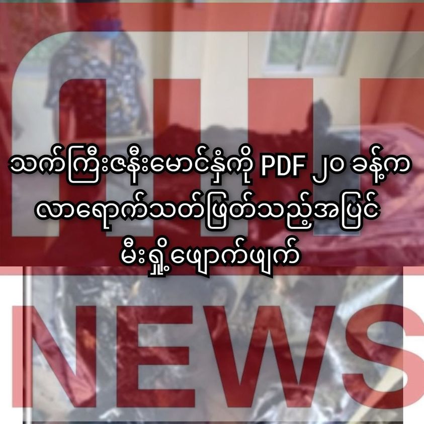 အသက် ၆၀ ပတ်လည် ဇနီးမောင်နှံနှစ်ဦးကို PDF ၂၀ ခန့်က လာရောက်သတ်ဖြတ်ကြပြီး မီးရှို့ အလောင်းဖျောက်ခဲ့လို့ သေနတ်ဒဏ်ရာ၊ မီးလောင်ဒဏ်ရာတွေနဲ့ သေဆုံးသွားရမှုဖြစ်ပွားခဲ့တယ်လို့ မြန်မာနိုင်ငံရဲတပ်ဖွဲ့က ထုတ်ပြန်ထားပါတယ်။