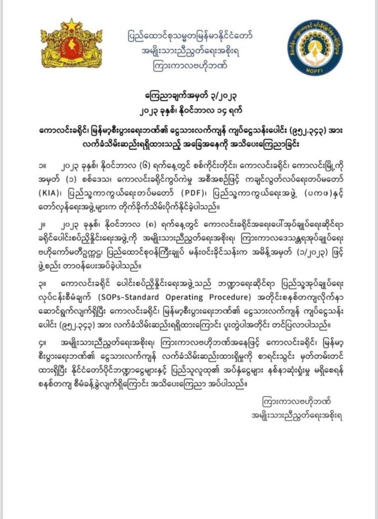 သို့ဖြစ်ပါ၍ ပုဂ္ဂလိကဘဏ်အသီးသီး၏ တာဝန်ရှိသူများအနေဖြင့် ခရိုင်ပေါင်းစပ်ညှိနှိုင်းရေးအဖွဲ့နှင့် အမြန်ဆုံး လာရောက် ဆက်သွယ်ပူးပေါင်းဆောင်ရွက်သွားရန်နှင့် လိုက်နာမှုမရှိပါက NUG ကြားကာလဗဟိုဘဏ်၏ ကြေညာချက်အမှတ်(၁/၂၀၂၃)ပါ ညွှန်ကြားချက်များနှင့်အညီ ဆက်လက်ဆောင်ရွက်သွားမည်ဖြစ်ကြောင်း အသိပေးထားသည်။