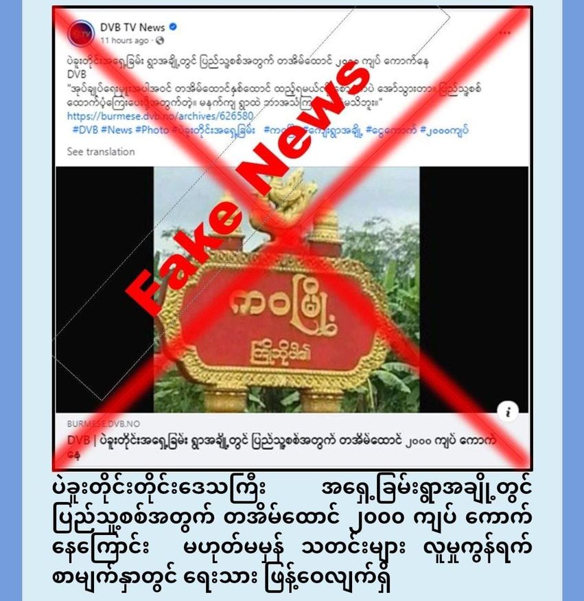 အလားတူ ပဲခူးတိုင်းဒေသကြီး၊ အရှေ့ခြမ်းရှိ ကျေးရွာတချို့၌ နိုဝင်ဘာ ၂၄ ရက်နေ့ညပိုင်းက ပြည်သူ့စစ်ထောက်ပံ့ကြေးအတွက်ဆိုပြီး တစ်အိမ်ထောင်လျှင် ၂၀၀၀ ကျပ်ထည့်ရန် အုပ်ချုပ်ရေးအဖွဲ့များမှ အသံချဲ့ စက်နှင့်အသိပေးခဲ့ပြီး မဖြစ်မနေထည့်ဝင်ရမယ်ဆိုကာ ခြိမ်းခြောက်သွားကြောင်း၊ ဒေသခံများကို နည်းလမ်းမျိုးစုံဖြင့် ငွေကြေးရယူမှုတွေမကြာခဏလုပ်နေကြောင်း၊ ကဝမြို့ဒေသခံများမှ ပြောကြားချက်အရ သိရှိရသည်ဟုမဟုတ်မမှန် သတင်းများ လူမှုကွန်ရက်စာမျက်နှာများတွင် ရေးသားဖြန့်ဝေလျက်ရှိကြောင်း တွေ့ ရှိရသည်။အဆိုပါ သတင်းနှင့်ပတ်သက်၍ ပဲခူးတိုင်းဒေသကြီး၊ အုပ်ချုပ်ရေးဆိုင်ရာ တာဝန်ရှိသူတစ်ဦးမှ “လုပ်ကြံသတင်းသာဖြစ်ကြောင်း၊ ဒေသခံပြည်သူများ၏ ရိုးသားသည့်စိတ်ဓာတ်ကို အခြေခံအသုံးချပြီး အထင်အမြင်လွဲမှားမှုဖြစ်စေရန် ရည်ရွယ်၍ သတင်းတု ထုတ်လွှင့်ခြင်းသာဖြစ်ကြောင်း” သိရှိရသည်ဟု ထုတ်ပြန်ချက်တွင် ဖော်ပြထားသည်။