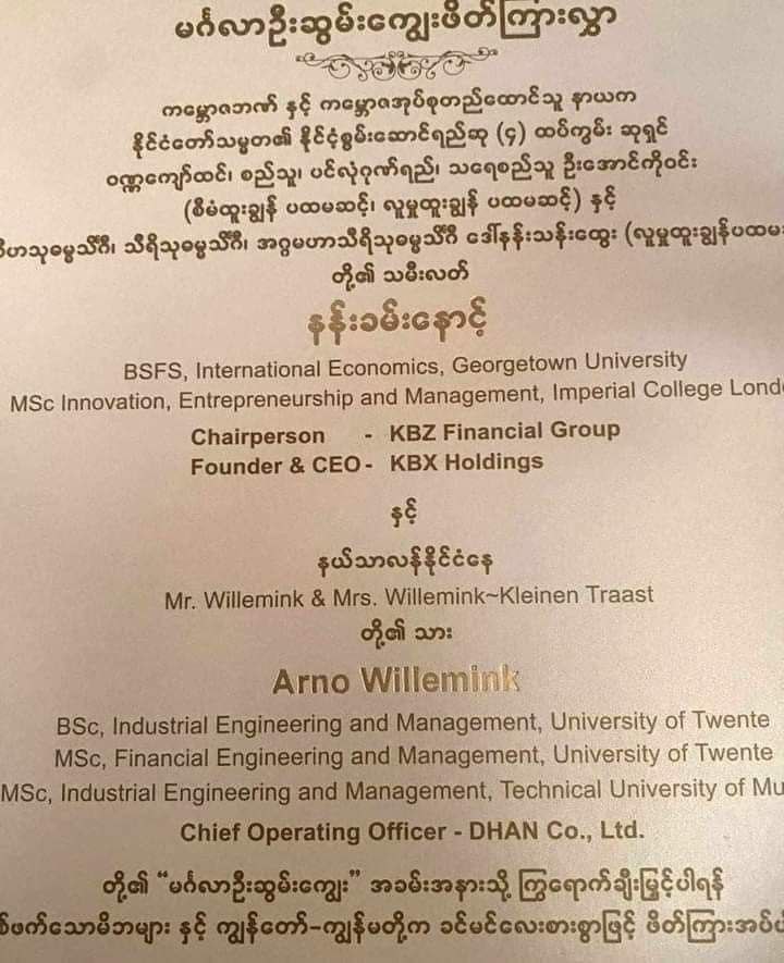 မင်္ဂလာဆောင်ခဲ့တဲ့ ဇနီးမောင်နှံကတော့ “ကမ္ဘောဇဘဏ် နှင့် ကမ္ဘောဇအုပ်စုတည်ထောင်သူ နာယက နိုင်ငံတော်သမ္မတ၏ နိုင်ငံ့စွမ်းဆောင်ရည်ဆု (၄) ထပ်ကွမ်း ဆုရှင် ဝဏ္ဏကျော်ထင်၊ စည်သူ၊ ပင်လုံဂုဏ်ရည်၊ သရေစည်သူ ဦးအောင်ကိုဝင်း (စီမံထူးချွန် ပထမဆင့်၊ လူမှုထူးချွန် ပထမဆင့်) နှင့် သီဟသုဓမ္မသိင်္ဂီ၊ သီရိသုဓမ္မသိင်္ဂီ၊ အဂ္ဂမဟာသီရိသုဓမ္မသိင်္ဂီ ဒေါ်နန်းသန်းထွေး (လူမှုထူးချွန်ပထမအဆင့်) တို့၏ သမီးလတ် နန်းခမ်းနောင့် နဲ့ နယ်သာလန်နိုင်ငံနေ Mr. Willemink & Mrs. Willemink-Kleinen Traast တို့၏ သား Arno Willemink တို့ဖြစ်ပါတယ်။
