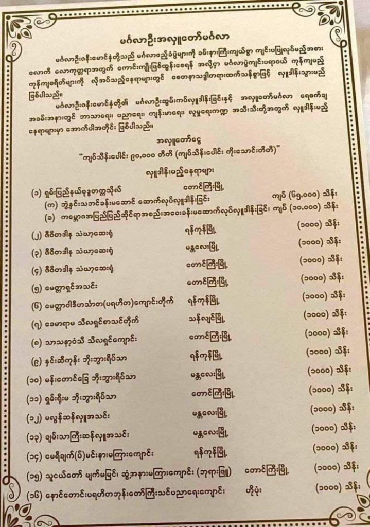 ဒါ့အပြင် ရန်ကုန်၊ မန္တလေးနဲ့ တောင်ကြီးက ဇီဝိတဒါန သံဃာ့ဆေးရုံတွေကို ကျပ်သိန်း ၁၀၀၀ စီ လှူဒါန်းမယ်လို့ ဖော်ပြထားသလို မေတ္တာရှင်အသင်း (တောင်ကြီးမြို့)၊ မေတ္တာဝါဒီဟင်္သာတ(ပရဟိတ)ကျောင်းတိုက်(ရန်ကုန်မြို့)၊ ခေမာရာမ သီလရှင်စာသင်တိုက်(သန်လျင်မြို့)၊ သာသနာ့ဝံသီ သီလရှင်ကျောင်း(တောင်ကြီးမြို့)၊ နှင်းဆီကုန်း ဘိုးဘွားရိပ်သာ(ရန်ကုန်မြို့)၊ မန်းတောင်ခြေ ဘိုးဘွားရိပ်သာ(မန္တလေးမြို့)၊ ရှမ်းရိုးမ ဘိုးဘွားရိပ်သာ(တောင်ကြီးမြို့)၊ မလွန်ဆန်လှူအသင်း(မန္တလေးမြို့)၊ ချမ်းသာကြီးဆန်လှူအသင်း(မန္တလေးမြို့)၊ မေရီချက်(ပ်)မင်းနားမကြားကျောင်း(ရန်ကုန်မြို့)၊ သူငယ်တော် မျက်မမြင်၊ ဆွံ့အနားမကြားကျောင်း (ဘုရားဖြူ.- တောင်ကြီးမြို့)နဲ့ နောင်တောင်းပရဟိတဘုန်းတော်ကြီးသင်ပညာရေးကျောင်း(ဟိုပုံး) တို့ကိုလည်း ကျပ်သိန်း ၁၀၀၀ စီ အသီးသီးလှူဒါန်းမယ်လို့ ဖော်ပြထားတာ တွေ့ရပါတယ်။