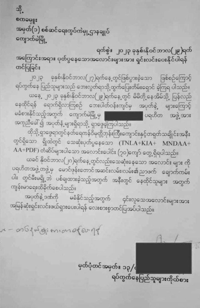 ပြီးခဲ့သည့် နိုဝင်ဘာ ၂၇ ရက်တွင် ဖြစ်ပွားခဲ့သည့် တိုက်ပွဲတွင် အလောင်းမကောက်နိုင်ဘဲ သေဆုံးစွန့်ပစ်ခံထားရသည့် PDF ၊ KIA၊ MNDAA၊ AA၊ TNLA တို့၏ အလောင်း ၇၀ ကျော်ကို ရှင်းလင်းပေးရန် ကျောက်မဲမြိုခံများက တောင်းဆိုသည့်စာ လူမှုကွန်ရက်၌ ပျံ့နှံလာခဲ့ပြီး တပ်နယ်မှူးက တာဝန်ယူရှင်းလင်းနေရသည်ဟုလည်း လူမှုကွန်ရက်တွင် ပျံ့နှံနေမှုအရ သိရသည်။