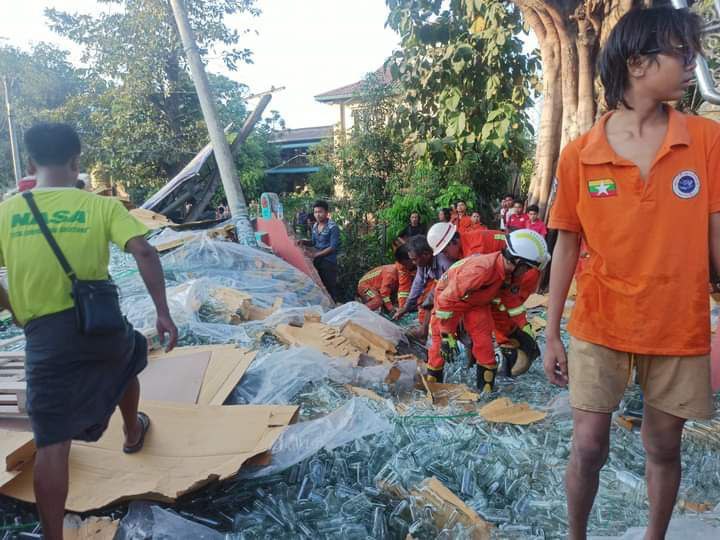 “ကားမှောက်တာမှာ ပလုံကောက်တဲ့ ဆိုင်ကယ်ဘေးတွဲပေါ်ပိမိတာပါ။ တစ်ယောက်တော့ ဆွဲထုတ်နိုင်ပြီ။ ပုလင်းတင်တဲ့တွဲကားဆိုတော့ ပုလင်းတွေနဲ့ပိနေလို့ အချိန်ကြာနေပါတယ်။ အသက် ၄၀ အရွယ် အမျိုးသားကို ဆွဲထုတ်နိုင်တာပါ။ အခြေအနေကတော့ မကောင်းဘူး။ အရိုးတွေ ကျိုးကြေ ဒဏ်ရာများပါတယ်။ အောက်ထဲလူကျန်မကျန် အတည်မပြုနိုင်သေးပါဘူး။ ပတ်ဝန်းကျင်ကတော့ ကလေးတစ်ဦးနဲ့ အမျိုးသမီးတစ်ဦး ကျန်တယ်ပြောတယ်” လို့ တောင်ငူ Save The Tree Recuse Team မှ ကိုကျော်သူရက MT News ကို ပြောပါတယ်။