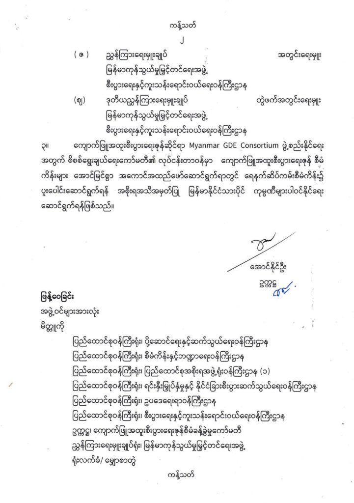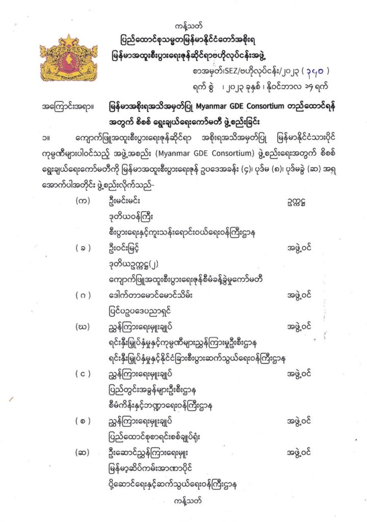 ကျောက်ဖြူအထူးစီးပွားရေးဇုန်ဆိုင်ရာ အစိုးရအသိအမှတ်ပြု မြန်မာနိုင်ငံသားပိုင် ကုမ္ပဏီများ ပါဝင်သည့် အဖွဲ့အစည်း (Myanmar GDE Consortium) ဖွဲ့စည်းရေးအတွက် စိစစ်ရွေးချယ်ရေးကော်မတီကို မြန်မာအထူးစီးပွားရေးဇုန် ဥပဒေအခန်း (၄)၊ ပုဒ်မ (၈)၊ ပုဒ်မခွဲ (ဆ)အရ ဖွဲ့စည်းခဲ့ခြင်းဖြစ်ကြောင်း ဖော်ပြထားသည်။