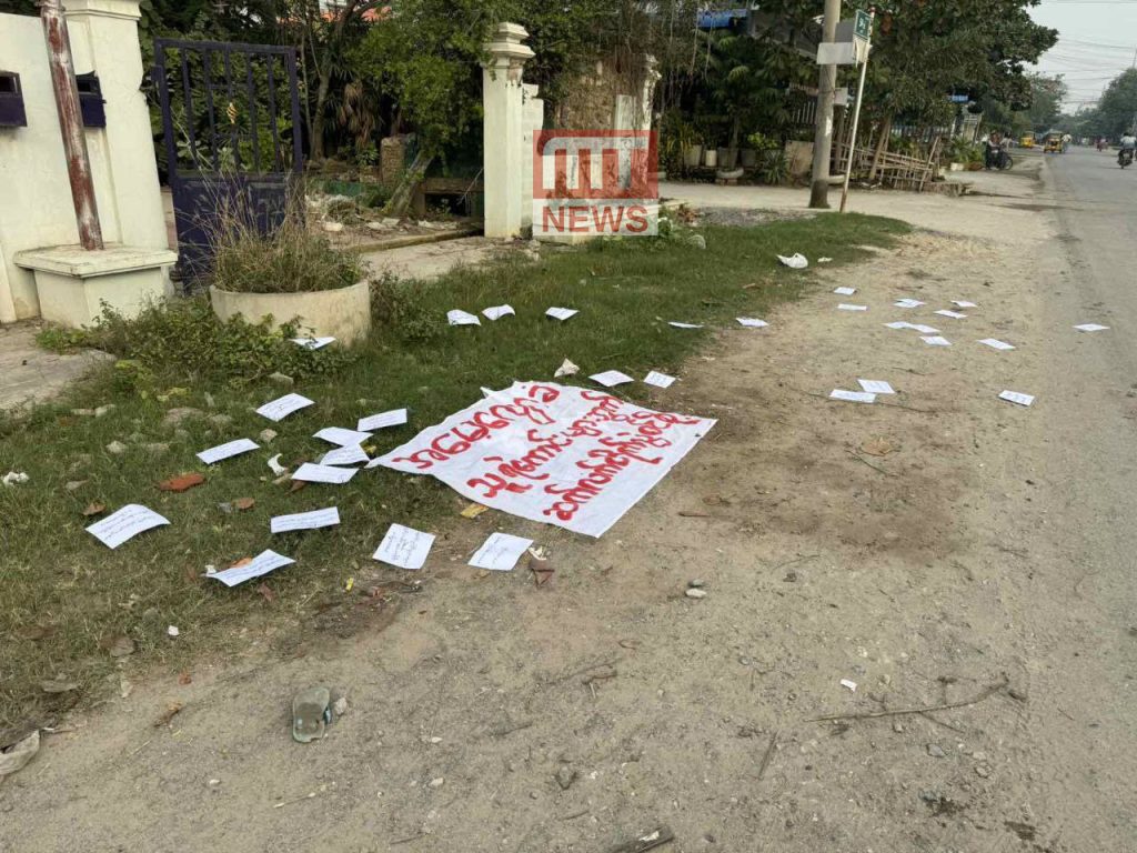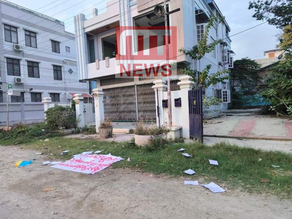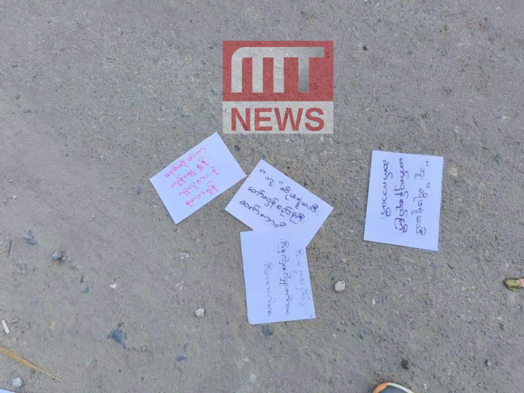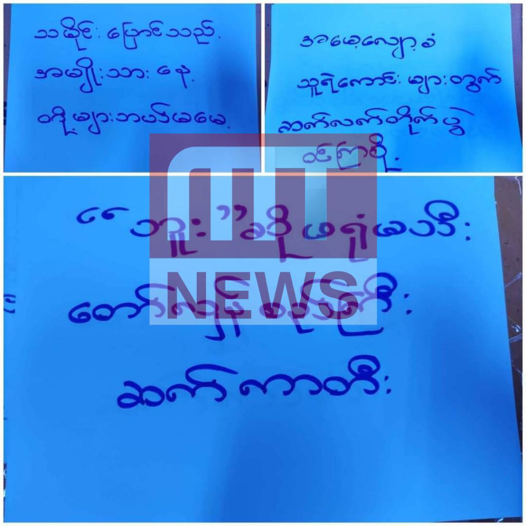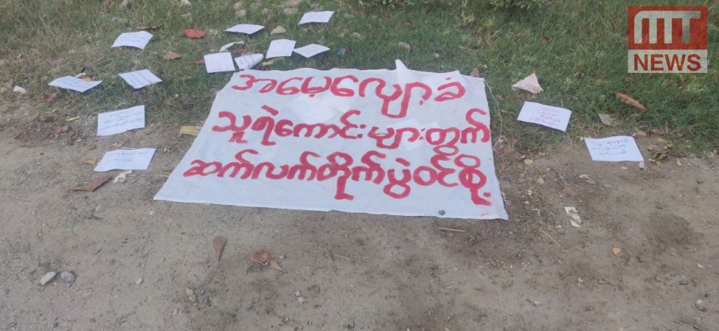 ယနေ့ အမျိုးသားနေ့ (ဒီဇင်ဘာ ၇ ရက်) မနက် ၇ နာရီ ၃၀ မိနစ်ခန့်က မန္တလေးတိုင်းဒေသကြီး၊ ချမ်းမြသာစည်မြို့နယ်၊ ထွန်တုံးရပ်ကွက်၊ ၅၄ လမ်း၊ ၁၁၁(E)နှင့် ၁၁၁(F)လမ်းကြားရှိ အကြမ်းဖက်မှုဖြင့် ချိပ်ပိတ်သိမ်းဆည်းထားရှိသော နှစ်ထပ်တိုက်ရှေ့တွင် အလျား ၄ ပေ၊ အနံ ၃ ပေခန့်ရှိ အဖြူရောင်ပိတ်စပေါ် အနီရောင်ဖြင့် “အမေ့လျော့ခံ သူရဲကောင်းများတွက် ဆက်လက်တိုက်ပွဲဝင်စို့”စာသားအား လမ်းဘေးခင်းထားပြီး အနီးတွင်လည်း စာရွက်အပိုင်းများဖြင့် ရေးသားဖြန့်ကြဲထားသည့် စာသားများတွေ့ရှိခဲ့ကြောင်း သိရသည်။