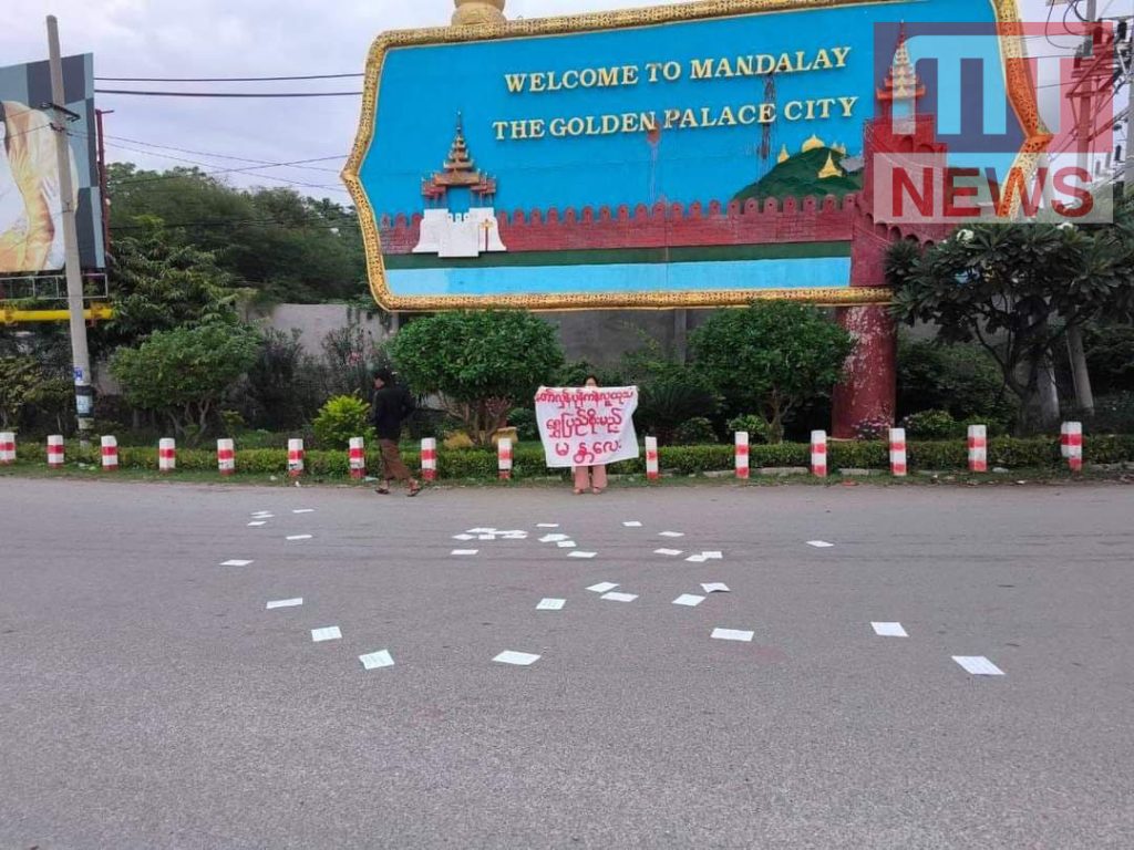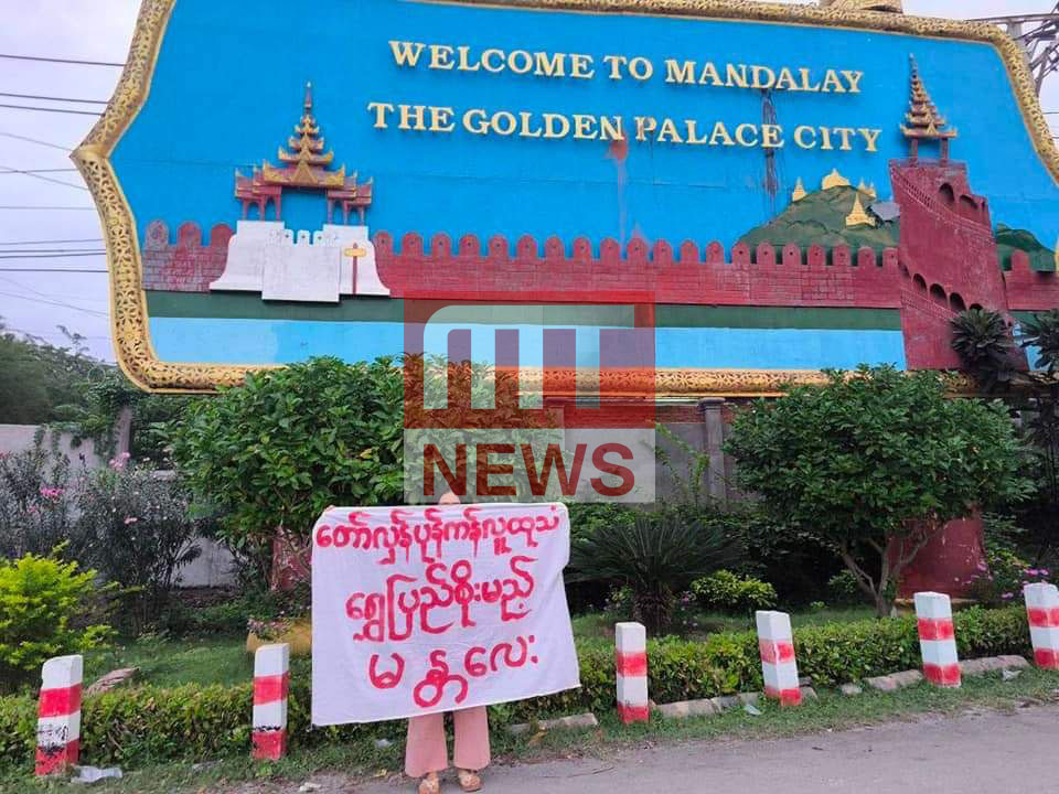 ထို့ပြင် မန္တလေးမြို့ဝင်ဆိုင်းဘုတ်များတွင်လည်း အဖြူရောင်ပိတ်စပေါ်တွင် အနီရောင်ဖြင့် ရေးသားထားသည့် “တော်လှန်ပုန်ကန်လူထုအသံ ရွှေပြည်စိုးမည့်မန္တလေး”စာသားကို ကိုင်ဆောင်ကာ မျက်နှာမပါဝင်သည့် ပုံများကိုပါ လူမှုကွန်ရက်စာမျက်နှာပေါ်တွေ့ရှိရသော်လည်း မြေပြင်တွင် လုံခြုံရေးတပ်ဖွဲ့ဝင်များ သွားရောက်စစ်ဆေးခဲ့ရာ မည့်သည့်အရာကိုမျှ မတွေ့ရှိခဲ့ရကြောင်းလည်း သိရသည်။