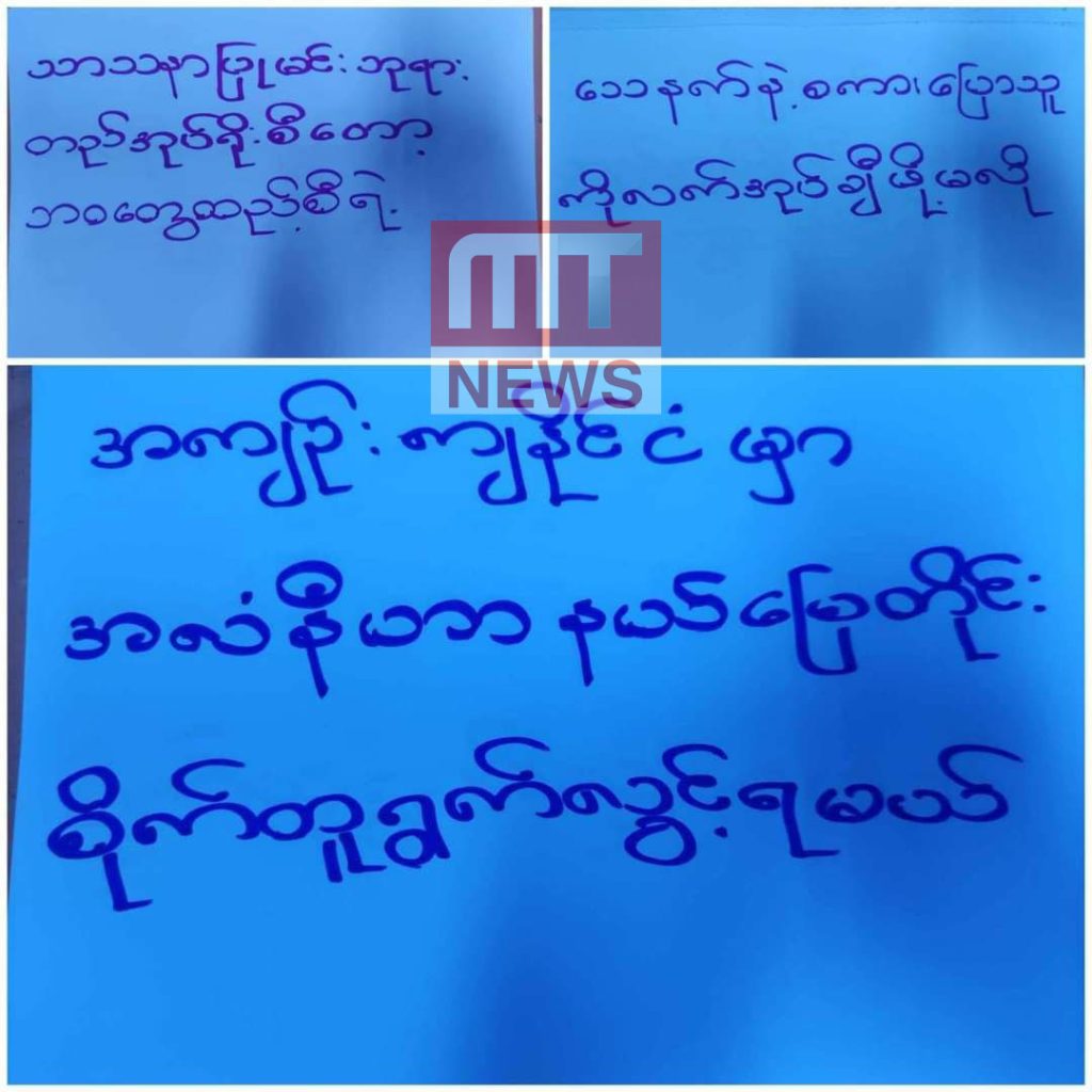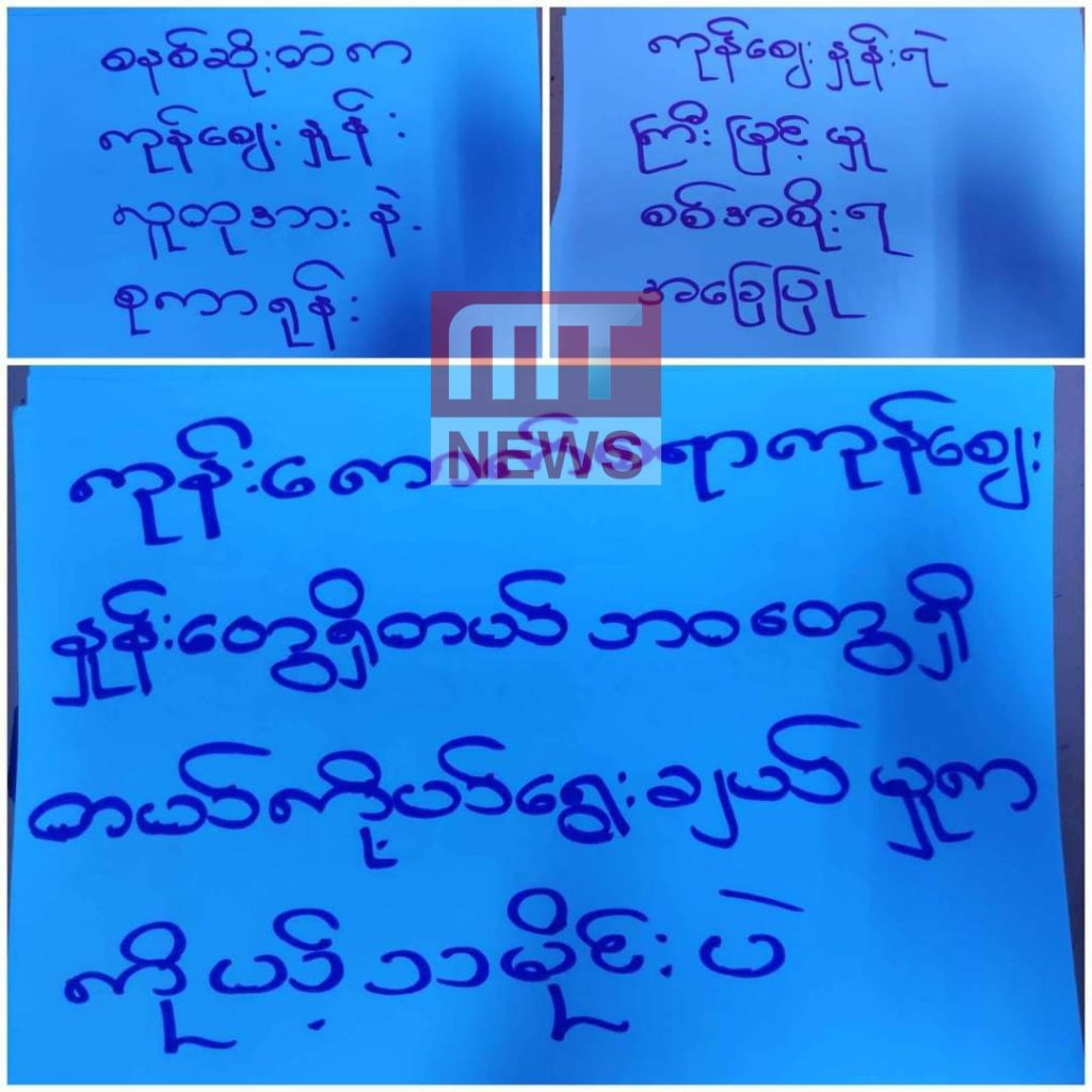 အဆိုပါအနီးတွင် တွေ့ရှိခဲ့သောစာသားများမှာ “တော်လှန်ပုန်ကန်လူထုအသံ ရွှေပြည်စိုးမည့်မန္တလေး”၊ “သမိုင်းပြောင်သည့်အမျိုးသားနေ့ တို့များဘယ်မနေ့”၊ “ဘူးဆိုဖရုံမသီး တော်လှန်စည်ကြီးဆက်ကာတီး”၊ “စနစ်ဆိုးထဲက ကုန်စျေးနှုန်းလူထုအားနဲ့ဆက်ကာရုန်း”၊ “အကျဥ်းကျနိုင်ငံမှာ အလံနီဟာနယ်မြေတိုင်းစိုက်ထူရွက်လွှင့်ရမည်” အစရှိသည့် စာတန်းများ ဖြစ်သည်။