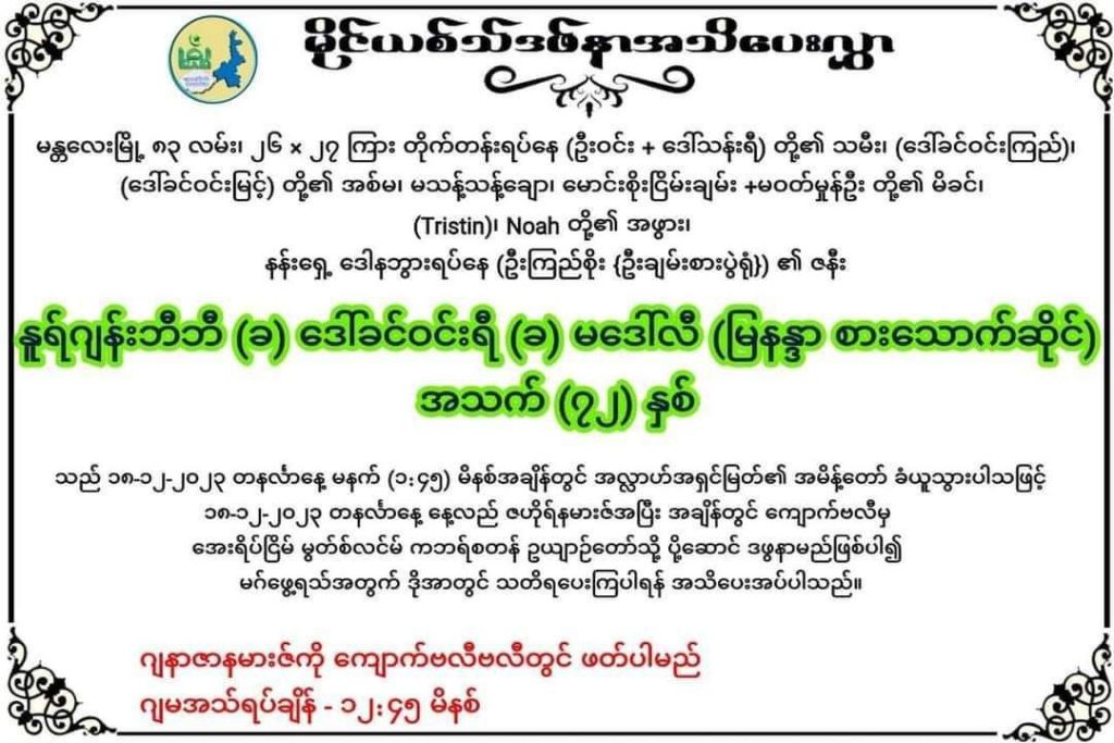 မဒေါ်လီရဲ့ ရုပ်အလောင်းကို ဒီနေ့ ဒီဇင်ဘာ ၁၈ ရက် နေ့လယ် ၁၂ နာရီ ၄၅ မိနစ်အချိန် ကျောက်ဗလီမှာ ဇဟိုရ်နမားဇ်အပြီး ဂျနာဇဟ်ဖတ်မှာဖြစ်တယ်လို့ ကျောက်ဗလီ လူမှုဆောင်ရွက်ရေးအသင်းက သိရပါတယ်။