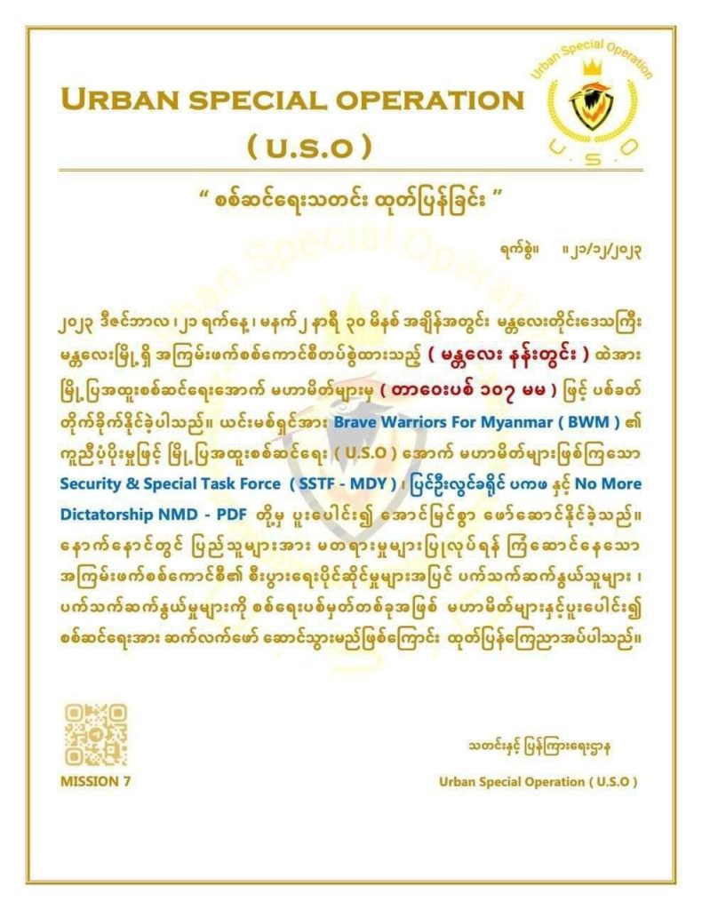 မန္တလေးနန်းတွင်းက အလယ်ပိုင်းတိုင်း စစ်ဌာနချုပ်ကို မန္တလေးမြို့ပြ ပြောက်ကျားတော်လှန်ရေးအဖွဲ့တွေ ပူးပေါင်းပြီး ရှော့တိုက်ဒုံး ၆ လုံးနဲ့ ပစ်ခတ်တိုက်ခိုက်ခဲ့တယ်လို့ Brave Warriors for Myanmar – BWM က
