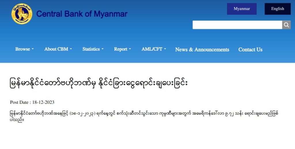 စက်သုံးဆီတင်သွင်းသော ကုမ္ပဏီများအတွက် လိုအပ်သည့် ဒေါ်လာများကို ဒီဇင်ဘာ ၁၈ ရက်တွင် ပထမဆုံးအကြိမ် ဒေါ်လာ ၉ ဒသမ ၇၂ သန်း ရောင်းချပေးခဲ့ပြီး ဒီဇင်ဘာ ၂၁ ရက် (ယနေ့)တွင် ဒေါ်လာ ၁၂ ဒသမ ၄၃ သန်း ထပ်မံရောင်းချပေးခဲ့၍ ရောင်းချပေးခဲ့သည့် နှစ်ကြိမ်အတွင်း စုစုပေါင်း ဒေါ်လာ ၂၂ ဒသမ ၁၅ သန်းအထိ ရောင်းချပေးခဲ့ကြောင်း မြန်မာနိုင်ငံတော်ဗဟိုဘဏ်မှ ထုတ်ပြန်ထားသည်။