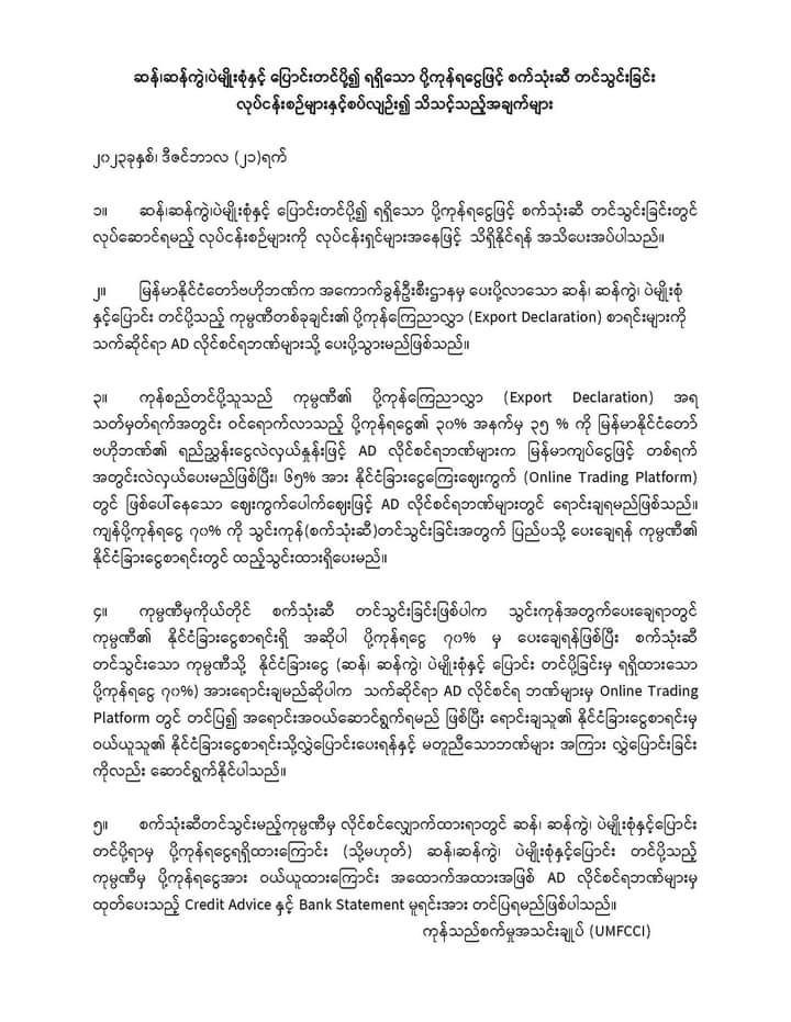 စက်သုံးဆီဝယ်ယူနိုင်ရေးအတွက် အစည်းအဝေးပြုလုပ်ခဲ့ပြီး ဆန်၊ ဆန်ကွဲ၊ ပဲမျိုးစုံနှင့် ပြောင်းတင်ပို့၍ ရရှိသော ပို့ကုန်ရငွေဖြင့် စက်သုံးဆီ တင်သွင်းခြင်း လုပ်ငန်းစဉ်များနှင့် စပ်လျဉ်း၍ သိသင့်သည့်အချက်များကို ကုန်သည်စက်မှုအသင်းချုပ် (UMFCCI)မှ ဒီဇင်ဘာ ၂၁ ရက်တွင် အသိပေး ထုတ်ပြန်ခဲ့သည်။