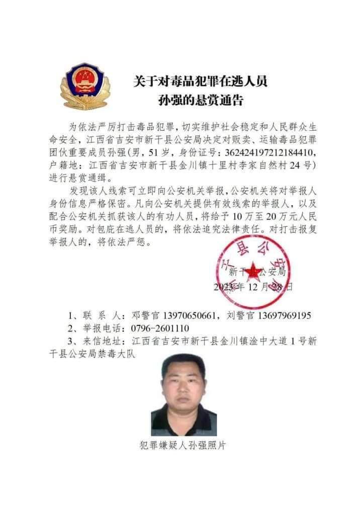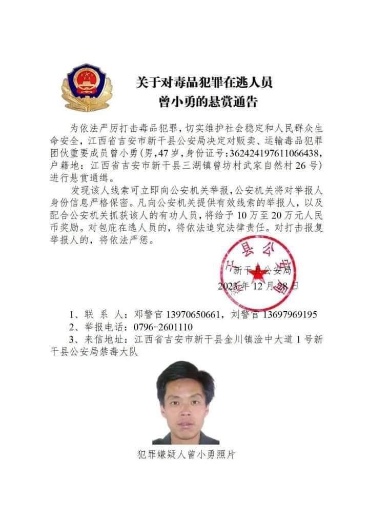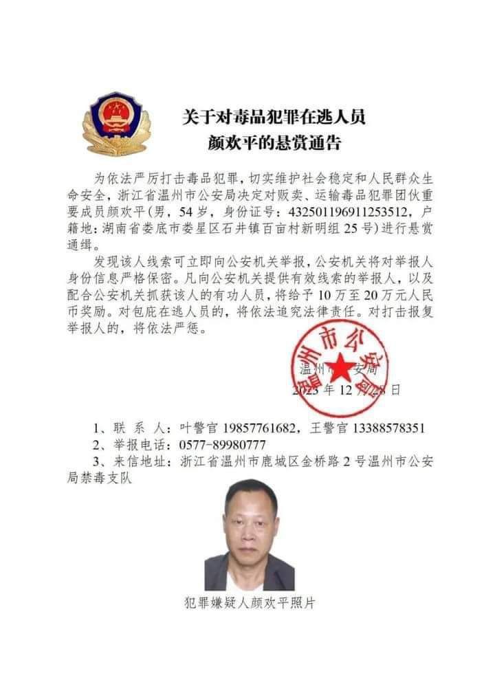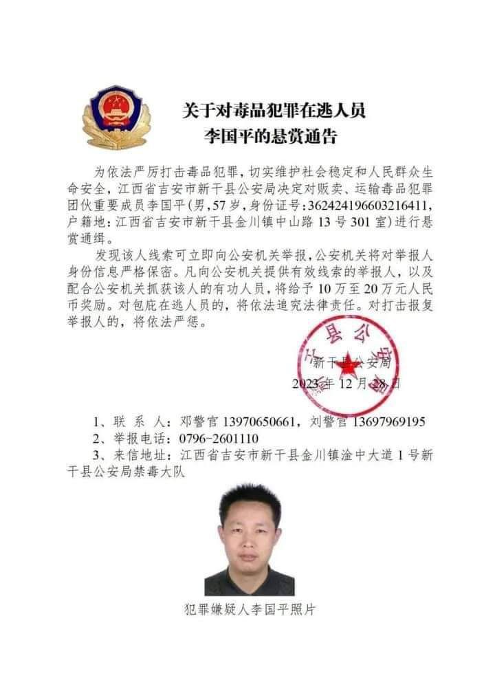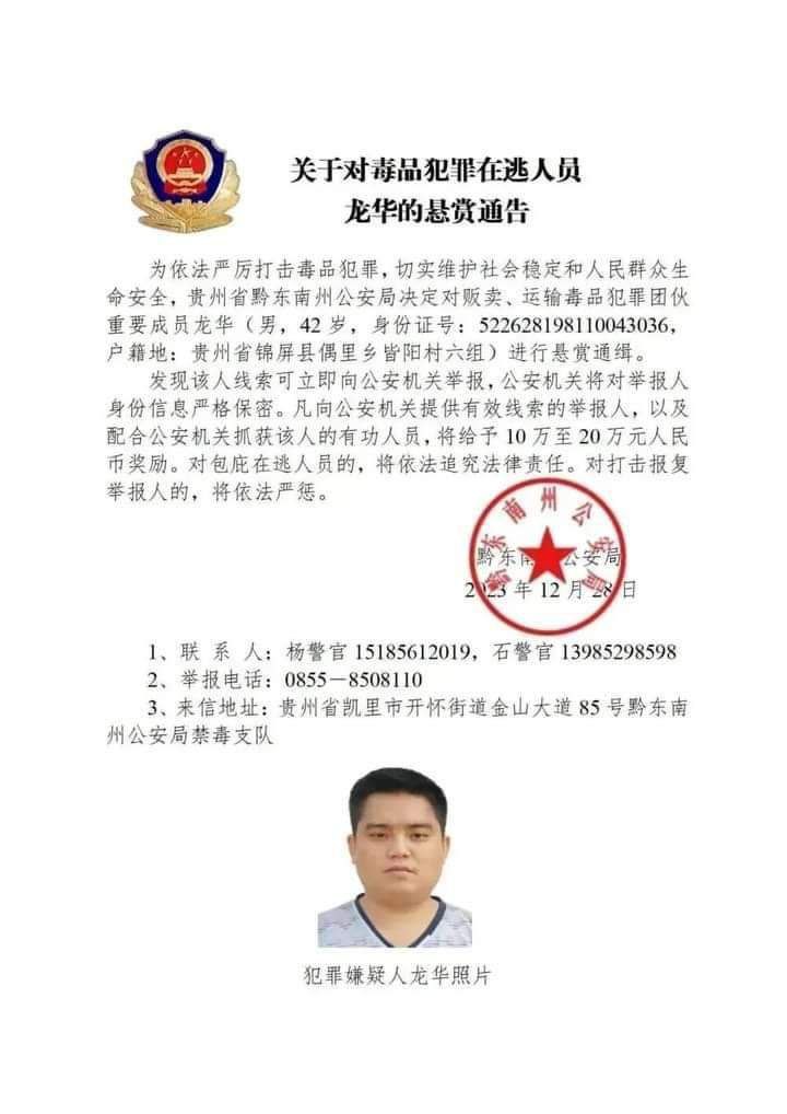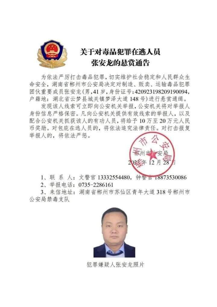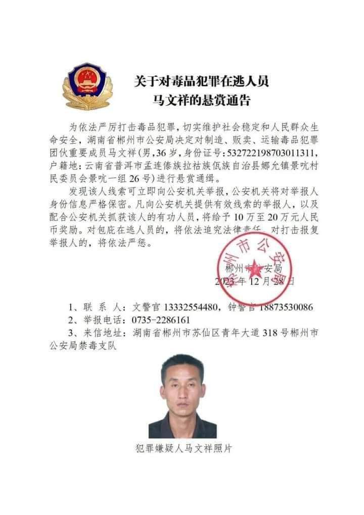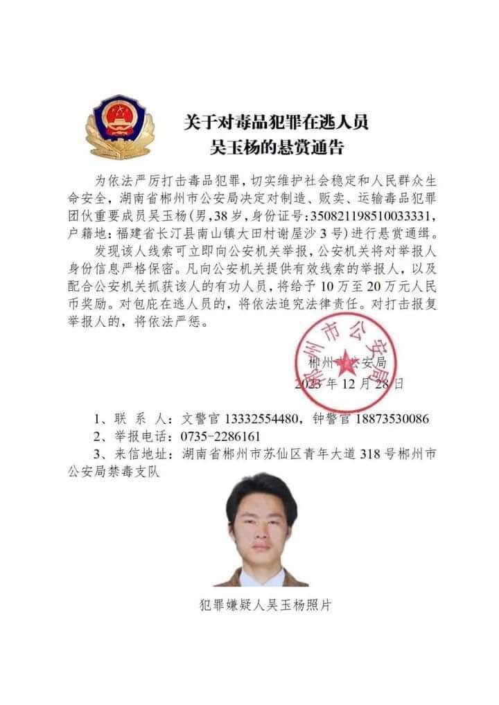 အဲ့ဒီ မူးယစ်ဆေးဝါးတရားခံတွေကို တရုတ်နိုင်ငံ ဟူပေပြည်နယ်၊ ယူနန်ပြည်နယ်၊ ဖူကျန်းပြည်နယ်၊ ကျန်းစီပြည်နယ်၊ ဟူနန်ပြည်နယ်၊ စီချွမ်းပြည်နယ်၊ ကွမ်ကျိုးပြည်နယ် စတဲ့ ပြည်နယ်အသီးသီးရဲ့ ပြည်သူ့လုံခြုံရေးဌာနတွေက မူးယစ်ဆေးဝါးဖြန့်ချိတဲ့ ဂိုဏ်းအဖွဲ့အသီးသီးရဲ့ အရေးပါတဲ့အဖွဲ့ဝင်တွေဖြစ်လို့ တရားခံပြေးအဖြစ် ဖမ်းဝရမ်းထုတ်လိုက်တာဖြစ်ပြီး အဲ့ဒီလူတွေကို သတင်းပေးရင် ယွမ်ငွေ ၁ သိန်းကနေ ၂ သိန်းထိ ဆုကြေးငွေပေးမယ်လို့လည်း ကြေညာလိုက်တာဖြစ်ပါတယ်။