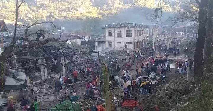 ပုံစာ။ မိုးကုတ်မြို့ ဗုံးကြဲခံရသောနေရာအား ပြည်သူများလာရောက်ကြည့်ရှုနေစဥ် (Photo / CJ)