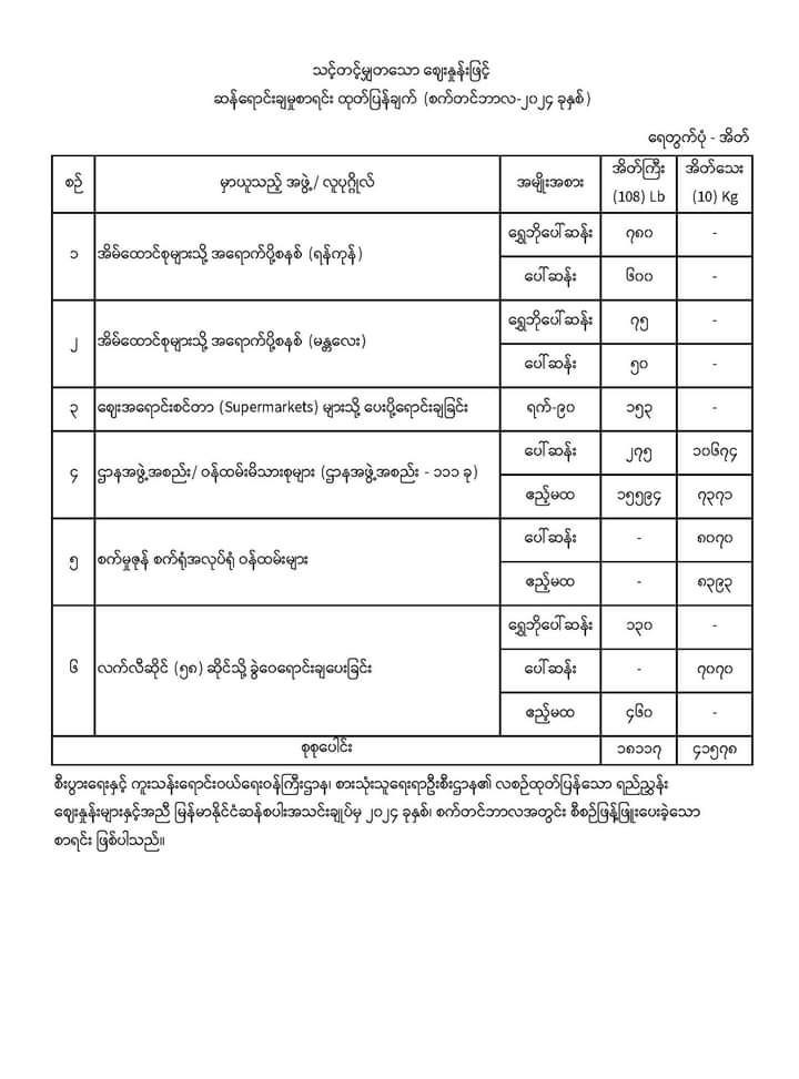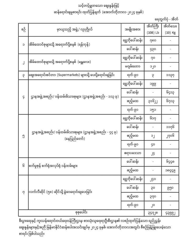 နိုဝင်ဘာလအတွက် သင့်တင့်မျှတသော ဆန်ဈေးနှုန်းထုတ်ပြန်ရာတွင် အဓိကပြည်တွင်းစားဆန် ဈေးနှုန်းများ ပြောင်းလဲမှုမရှိသည့်အပြင် ပေါ်ဆန်းဆန်ဈေးနှုန်းအား အမျိုးအစားအပေါ်မူတည်ကာ တစ်အိတ်လျှင် ကျပ် ၁၂၅,၀၀၀ မှ ၁၄၅,၀၀၀ ကြားသတ်မှတ်ထားသလို အခြားဆန်အမျိုးအစားများနှင့် ဈေးဝယ်စင်တာများတွင် ဝယ်ယူရမည့် ဆန်ဈေးနှုန်းများကိုပါ အောက်တိုဘာလ ဈေးနှုန်းအတိုင်း သတ်မှတ်ထားကြောင်း စားသုံးသူရေးရာဦးစီးဌာနမှ ထုတ်ပြန်ထားသည့် ရည်ညွှန်းဆန်ဈေးနှုန်းအရ သိရသည်။