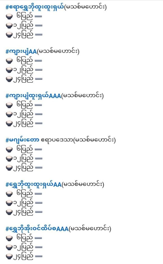 “ကြေညာတဲ့ Page မှာက ဈေးနှုန်းပြောလို့မရလို့။ အတက်အကျရှိလို့လေ။ ဧရာရွှေဘိုဆန်က ၁၅၄,၀၀၀ သူက ဧရာဝတီတိုင်းက ထွက်တဲ့ရွှေဘိုအမျိုးအစား၊ ရွှေဘိုထူးထူးရှယ်ကတော့ ရွှေဘိုအစစ်ပေါ့။ ရွှေဘိုမှာက နှစ်မျိုးရှိမယ်။ ၁၇၉,၀၀၀ နဲ့ ၂၀၇,၀၀၀ နှစ်မျိုးရှိမယ်” ဟု အိမ်အရောက်ပို့စနစ်ဖြင့်ပါ ရောင်းချနေသည့် ရန်ကုန်မြို့တွင်းရှိ ဆန်ရောင်းဝယ်ရေးဆိုင်တစ်ခုမှ တာဝန်ရှိသူက ပြောသည်။