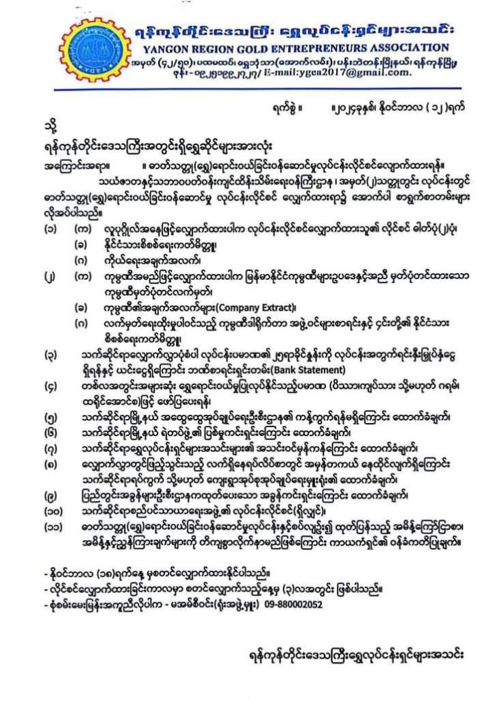 ရွှေလုပ်ငန်းကုမ္ပဏီများနှင့် လူပုဂ္ဂိုလ်များအနေဖြင့် ရွှေရောင်းဝယ်ခြင်း ဝန်ဆောင်မှုလုပ်ငန်း လိုင်စင်အတွက် နိုဝင်ဘာလ ၁၈ ရက်တွင် စတင်လျှောက်ထားနိုင်ပြီး လိုင်စင်လျှောက်ထားခြင်းကာလမှာ စတင်လျှောက်ထားသည့်နေ့မှ သုံးလအတွင်းဖြစ်ကြောင်း ရန်ကုန်တိုင်းရွှေလုပ်ငန်းရှင်များအသင်း (YGEA) မှ ယနေ့တွင် အသိပေးကြေညာထားသည်။