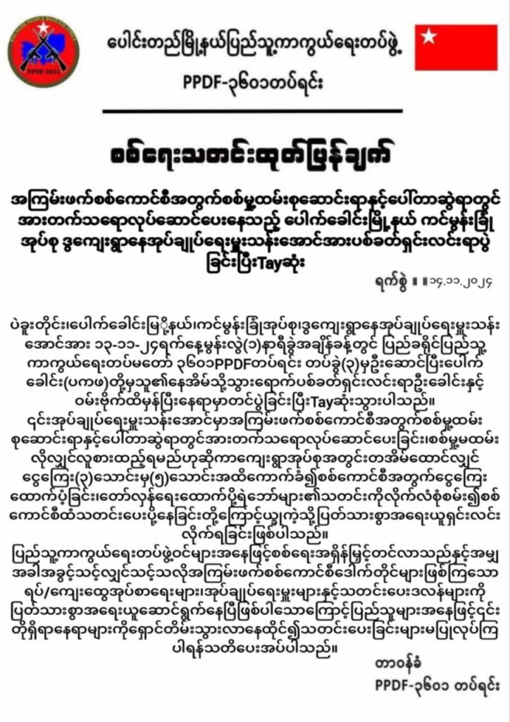 ပဲခူးတိုင်း၊ ပေါက်ခေါင်းမြို့နယ်၊ ကင်မွန်းခြုံအုပ်စု ဒွကျေးရွာအုပ်ချုပ်ရေးမှူး ဦးသန်းအောင်အား ပစ်ခတ်သတ်ဖြတ်လိုက်သည်ဟု ကျူးလွန်သည့် ပေါင်းတည် PDF အဖွဲ့က ဝန်ခံချက် ထုတ်ပြန်လာသည်။