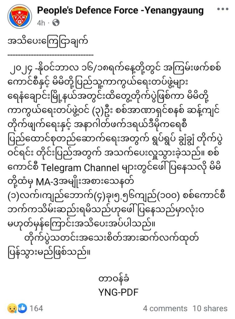 ဒါပေမဲ့ တပ်မတော်နဲ့နီးစပ်တဲ့ တယ်လီဂရမ်တွေမှာ ဖော်ပြထားသလို PDF တွေဆီက MA – 3 တစ်လက်နဲ့ ကျည်ဘောက်လေးခု 5.56 ကျည်တောင့် ၁၀၀ ဖမ်းမိတယ်ဆိုတာက မမှန်ဘူးလို့လည်း ရေနံချောင်းပကဖက ငြင်းဆိုထားပါတယ်။