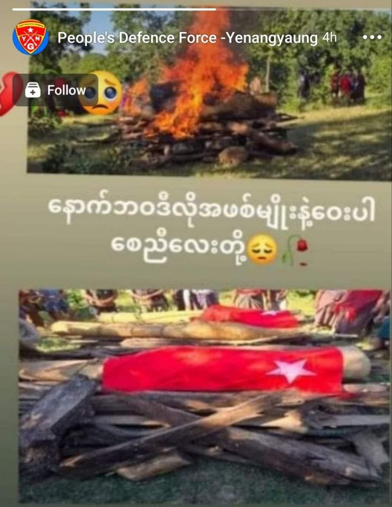 နိုဝင်ဘာ ၁၆ ရက်နဲ့ ၁၈ ရက် တိုက်ပွဲတွေမှာ သေဆုံးခဲ့တဲ့ PDF သုံးဦးကိုတော့ အလောင်းမီးရှို့လိုက်ပြီး “နောင်ဘဝ ဒီလိုအဖြစ်မျိုးနဲ့ ဝေးပါစေ ညီလေးတို့”လို့ ဆုတောင်းရင်း ရေနံချောင်းပကဖက My Day မှာ ဖော်ပြထားပါတယ်။