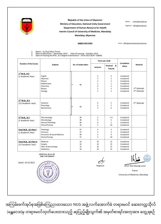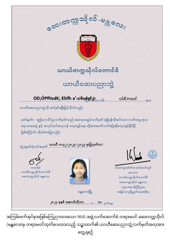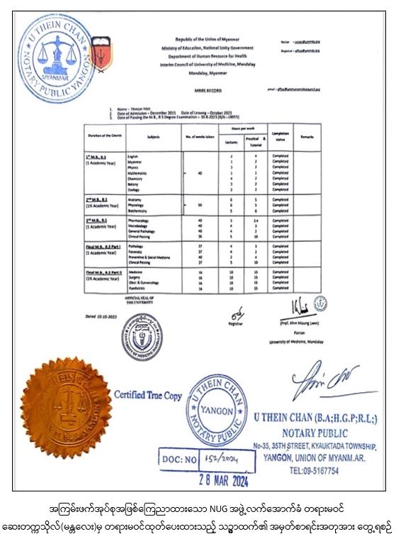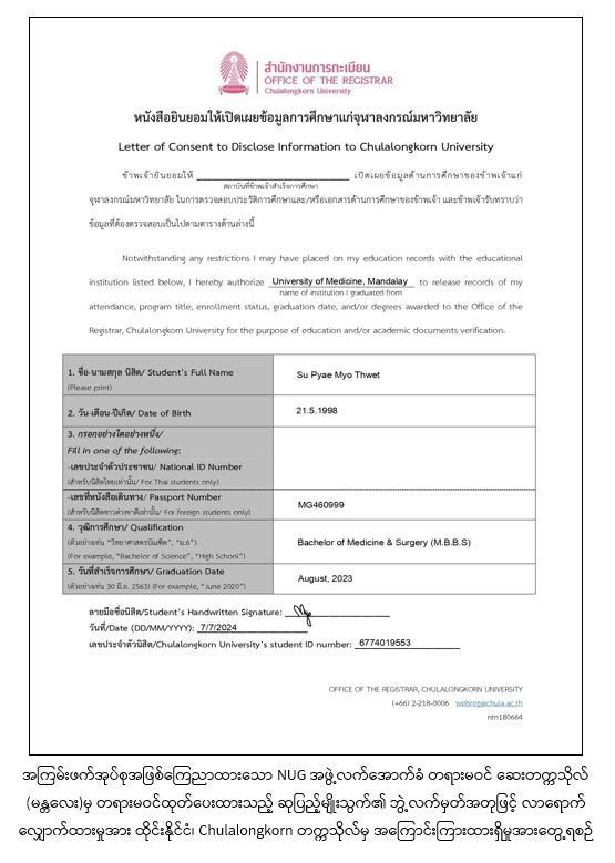 NUG လက်အောက်ခံ တရားမဝင်ဆေးတက္ကသိုလ် (မန္တလေး)မှ ယာယီဆေးပညာဘွဲ့လက်မှတ်အတုများဖြင့် ထိုင်းနိုင်ငံ၊ Chulalongkom တက္ကသိုလ်သို့ တက်ရောက်ရန် ဆောင်ရွက်ခဲ့မှုကို ချုလာလောင်ကွန်းတက္ကသိုလ်မှ မြန်မာပြည်တွင်းရှိ တရားဝင်မန္တဆေးတက္ကသိုလ်သို့ စိစစ်ပေးပါရန် သံသယဖြင့် အကြောင်းကြားလာရာမှ ဘွဲ့လက်မှတ်ထုတ်ပေးသည့် တရားခံများ ဖမ်းမိခဲ့ကြောင်း သိရသည်။