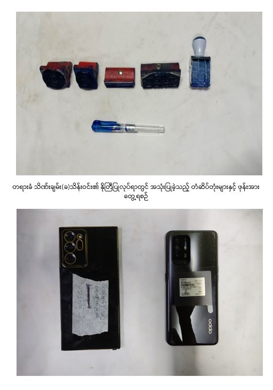 အဆိုပါ ယာယီဆေးပညာဘွဲ့လက်မှတ်အတုများအား ပြုလုပ်ပေးသူ ရန်ကုန်တိုင်းဒေသကြီး၊ ကျောက်တံတားမြို့နယ်၊ (၃၅)လမ်း၊ တိုက်အမှတ်(၃၅)၊ တတိယထပ်တွင် ရုံးခန်းဖွင့်လှစ်ထားသည့် သိဏ်းချမ်း(ခ)သိန်းဝင်း(B.A; H.G.P;RL;) Notary Public မှ တရားမဝင် Notary (သက်သေခံချက်) ပြုလုပ်ပေးခဲ့ကြောင်း သိရှိရသည့်အတွက် နိုဝင်ဘာလ ၂၁ ရက်တွင် တရားမဝင် Notary(သက်သေခံချက်)ပြုလုပ်ပေးခဲ့သည့် ရန်ကုန်တိုင်းဒေသကြီး၊ ပန်းဘဲတန်းမြို့ နယ်နေ တရားခံ သိဏ်းချမ်း(ခ)သိန်းဝင်းနှင့် သင်္ဃန်းကျွန်းမြို့နယ်နေ တရားခံ သက်ထက်ဦး(ခ)ဝင်းထက်မြတ်တို့ ၂ ဦးအား ၎င်းတို့ရုံးခန်း၌ စာရွက်စာတမ်းများ အတုပြုလုပ်ရာတွင် အသုံးပြုသည့် သက်သေခံ ပစ္စည်းများနှင့်အတူ ဖမ်းဆီးရမိခဲ့ပါသည်။