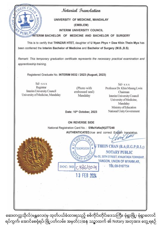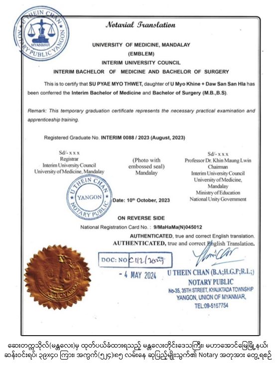 ထို့အတူ အကြမ်းဖက်အုပ်စုအဖြစ် ကြေညာထားသော NUG အဖွဲ့လက်အောက်ခံ တရားမဝင် ဆေးတက္ကသိုလ်(မန္တလေး)၊ ယာယီတက္ကသိုလ်ကောင်စီမှ ထုတ်ပေးခဲ့သည့် ယာယီဆေးပညာဘွဲ့ လက်မှတ်အတုတို့အား Notary(သက်သေခံချက်) ပြုလုပ်ပေးခဲ့သည့် ဖမ်းဆီးရမိတရားခံသိဏ်းချမ်း(ခ)သိန်းဝင်း၊ သက်ထက်ဦး(ခ)ဝင်းထက်မြတ်နှင့် မြတ်မင်းသူတို့ ၃ ဦးနှင့်အတူ ပါဝင်ပတ်သက်သူများအား ထိရောက်စွာ အရေးယူဆောင်ရွက်သွားမည်ဖြစ်ပါသည်။