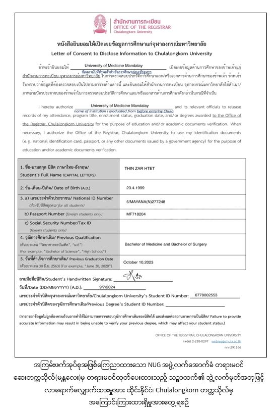 ၎င်းတို့ ၂ ဦးသည် အကြမ်းဖက်အုပ်စုအဖြစ် ကြေညာထားသော NUG အဖွဲ့ လက်အောက်ခံ တရားမဝင်ဆေးတက္ကသိုလ် (မန္တလေး)၊ ယာယီတက္ကသိုလ်ကောင်စီနာယက သစ္စာမဲ့ဝန်ထမ်း (Disloyalty Civil Servant-DCS)ဖြစ်သူ ခင်မောင်လွင် (ဆေးတက္ကသိုလ်-မန္တလေး၊ ပါမောက္ခချုပ်ဟောင်း)မှ တရားမဝင်ထုတ်ပေးခဲ့သည့် ယာယီဆေးပညာဘွဲ့လက်မှတ်အတုတို့ဖြင့် ထိုင်းနိုင်ငံ၊ Chulalongkom တက္ကသိုလ်သို့ တက်ရောက်ခွင့်ရရှိရေးအတွက် တရားမဝင်လျှောက်ထားခဲ့ကြောင်း သိရှိရသည်။