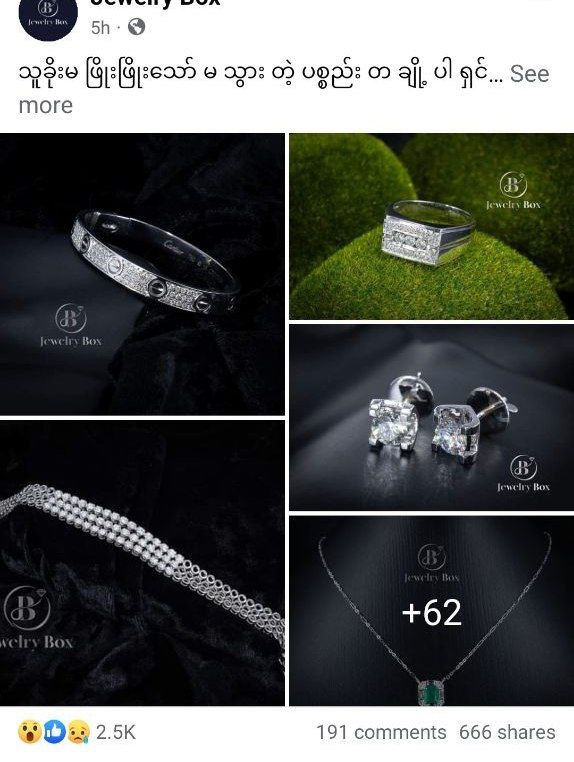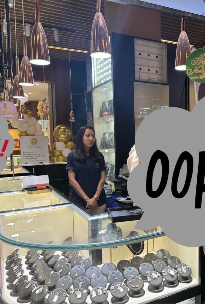 စိန်ဆိုင်ဝန်ထမ်းက ငွေကျပ် သိန်းသုံးထောင်နီးပါး GIA စစ်ချက်ပါရှိတဲ့ စိန်ထည် လက်ဝတ်ရတနာတွေ ခိုးယူထွက်ပြေးခဲ့တာကြောင့် စခန်းမှာ အမှုဖွင့်လှစ်ဆောင်ရွက်နေတဲ့အပြင် အဆိုပါဝန်ထမ်းကိုတွေ့ရှိပါက အကြောင်းကြားပေးသူကိုလည်း ငွေကျပ်သိန်းငါးဆယ် ဆုချီးမြှင့်မယ်လို့ Jewelry Box စိန်ဆိုင်က ကြေညာလာပါတယ်။