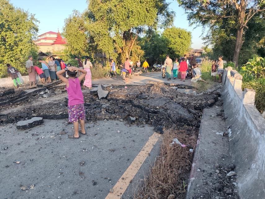 “မနေ့ည ၁၁ နာရီလောက်မှာဖြစ်တာပေါ့။ မိုင်းခွဲခံရတာပါ။ တံတားပေါ်က ကတ္တရာတွေ အကုန်ကြွသွားတယ်။ တံတားပေါ်က လမ်းပျက်သွားတာပေါ့။ အခု အဲ့ဘေးလမ်းနေရာလွတ်ကနေ ၁၃ တန်ကားတွေကို ပေးဖြတ်နေတယ်။ ကုန်ကားကြီးတွေ ဝိတ်ပါတဲ့ကားတွေကတော့ ဖြတ်လို့မရသေးဘူး။ စောင့်နေရသေးတယ်။ တံတားကြံ့ခိုင်မှုအားနည်းနေလို့ ပေးမဖြတ်သေးဘူး။ ခရီးသည်တင် Express တွေကတော့ ခရီးသည်တွေလမ်းဆင်းလျှောက် ကားကြီးပဲဖြတ်ခွင့်ပြုနေတယ်။ အခုတံတားအောက်ကနေလည်း ရှောင်ကွင်းလမ်းလုပ်နေသလို တံတားပြန်ပြင်ဖို့လည်း လုပ်နေတာတွေ့ရပါတယ်”လို့ ရေးမြို့နယ်အတွင်းက လူမှုကူညီရေးသမားတစ်ဦးက MT News ကို ပြောပြပါတယ်။