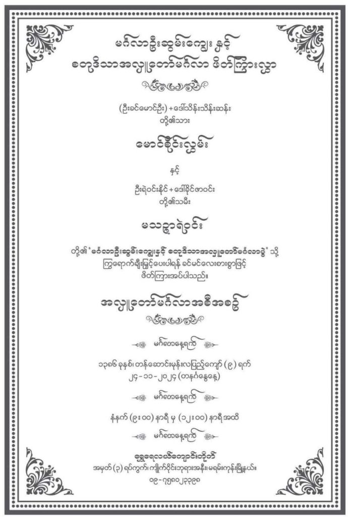“ခု နိုဝင်ဘာ ၂၇ ရက်မှာ ငွေဆောင်မှာ Dinner Part လေးကျင်းပမယ်။ ဒီဇင်ဘာ ၂၀ ရက်မှာ မန္တလေးက မိသားစုမိတ်ဆွေတွေပါ ထပ်ပြီး ပျော်ရွှင်ရအောင် နံနက်ပိုင်းဆွမ်းကပ်နဲ့ ညပိုင်းမှာ ကုက္ကိုလ်ကျွန်းမှာ Wedding Dinner စီစဉ်ပေးလို့ သားနဲ့သမီးက ကျေးဇူးအများကြီးတင်ပါတယ်မေမေ (ကိုကို့မေမေ)။ အစစအရာရာ အဘက်ဘက်က လူရောစိတ်ပါ ကူညီပေးကြသူများကိုလည်း ကျေးဇူးအထူးတင်ပါတယ်ရှင် ” လို့ သဉ္ဇာရဲဝင်းက ပရိသတ်သိအောင် Facebook က ပြောလာပါတယ်။