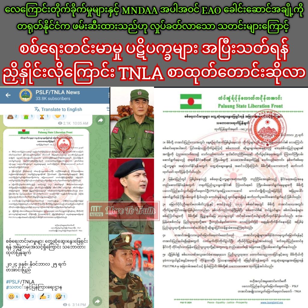 လေကြောင်းတိုက်ခိုက်မှုများနှင့် MNDAA ခေါင်းဆောင်ဖုန်တာ့ရွှင် အပါအဝင် EAO ခေါင်းဆောင်အချို့ကို တရုတ်နိုင်ငံက ဖမ်းဆီးထားသည်ဟု ထပ်မံ လှုပ်ခတ်လာသော သတင်းများကြောင့် စစ်ရေးတင်းမာမှု ပဋိပက္ခများအပြီးသတ်ရန် ညှိနှိုင်းလိုကြောင်း TNLA က တောင်းဆိုစာကို ယနေ့ ထုတ်ပြန်လာသည်။