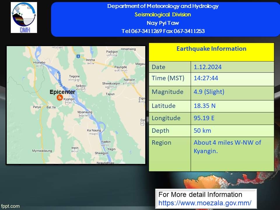 ငလျင်လှုပ်ခတ်မှုက ၂၀၂၄ ခုနှစ်၊ ဒီဇင်ဘာ ၁ ရက်၊ မြန်မာစံတော်ချိန် နေ့လယ် ၂ နာရီ၊ ၂၇ မိနစ်၊ ၄၄ စက္ကန့် အချိန်မှာ တောင်ငူမြေငလျင်စခန်း အနောက်တောင်ဘက် မိုင် (၉၀) ခန့် ကွာဝေးတဲ့ မြန်မာနိုင်ငံပြည်တွင်း ကြံခင်းမြို့ရဲ့ အနောက် -အနောက်မြောက်ဘက် ၄ မိုင်ခန့် အကွာ၊ မြောက်လတ္တီတွဒ် ၁၈ ဒသမ ၃၅ ဒီဂရီ၊ အရှေ့လောင်ဂျီတွဒ် ၉၅ ဒသမ ၁၉ ဒီဂရီ၊ အနက် ၅၀ ကီလိုမီတာ(၃၁ ဒသမ ၀၆၉ မိုင်) ကို ဗဟိုပြုလို့ အင်အားရစ်(ခ်)တာစကေး ၄ ဒသမ ၉ အဆင့်ရှိ အင်အားအနည်းငယ်ရှိတဲ့ မြေငလျင်တစ်ခု လှုပ်ရှားသွားတာပါ။