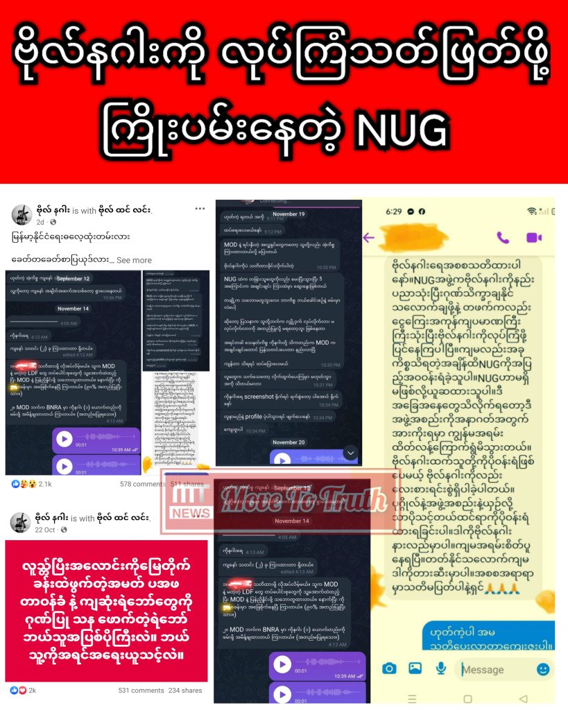 ဗိုလ်နဂါးကို NUG က သတ်ဖြတ်ဖို့ စီစဥ်တာနဲ့ ပတ်သက်ပြီး NUG မှာ တာဝန်ထမ်းဆောင်သူတစ်ဦးနဲ့ NUG ကို ဝန်းရံထောက်ခံသူတစ်ဦးက NUG ဟာ ဗိုလ်နဂါးကို ဖမ်းဝရမ်းထုတ်ထားကြောင်း၊ ဗိုလ်နဂါးရဲ့ တော်လှန်ရေးထိခိုက်အောင် နည်းပညာမျိုးစုံနဲ့ သိက္ခာချဖို့ လုပ်ဆောင်ထားကြောင်း၊ ငွေကုန်ကြေးကျခံပြီး လုပ်ကြံသတ်ဖြတ်ဖို့အထိပါ ပြင်ဆင်ထားကြောင်း သတိပေးမှုကို ဗိုလ်နဂါးက လူမှုကွန်ရက်မှာ ဖွင့်ဟလာတာပါ။