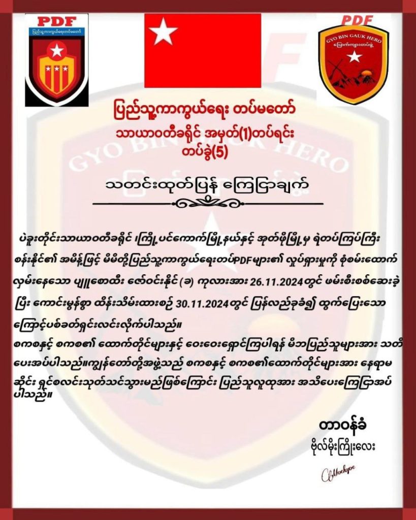ပလုံကောက်သူ၊ နှီးရောင်းသူပါမချန် သတင်းပေး၊ ဒလန်စွပ်စွဲကာ နေ့စဥ်လူသတ်နေသည့် NUG ဩဇာခံ ကြို့ပင်ကောက် PDF က ယခုရက်ပိုင်းအတွင်း ရှစ်ယောက်မြောက်အဖြစ် လူနှစ်ဦးကို ထပ်မံသတ်ဖြတ်လိုက်ကြောင်း ဝန်ခံချက် ထုတ်ပြန်ထားသည်။