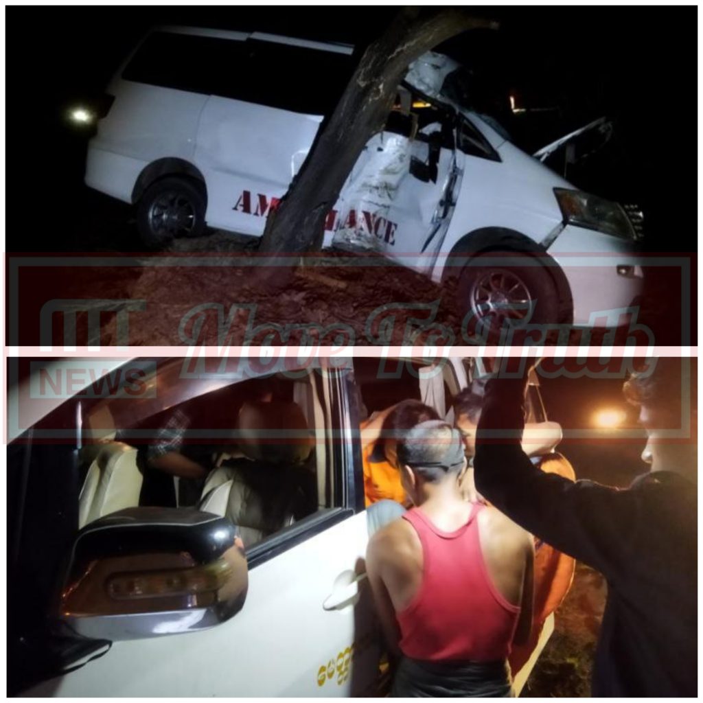 နေပြည်တော်-ရန်ကုန်အမြန်လမ်းမကြီး၊ မိုင်တိုင်အမှတ်(၅၇/၁) တွင် ဒီဇင်ဘာလ ၅ ရက် ညနေ ၆ နာရီ ၂၅ မိနစ်ခန့်က လူနာတင်ယာဥ်တစ်စီးမှာ လမ်းလယ်ကျွန်းရှိ သစ်ပင်ကို ဝင်တိုက်ရာက အမျိုးသားတစ်ဦး ထိခိုက်ဒဏ်ရာ ရရှိခဲ့ကြောင်း သိရသည်။