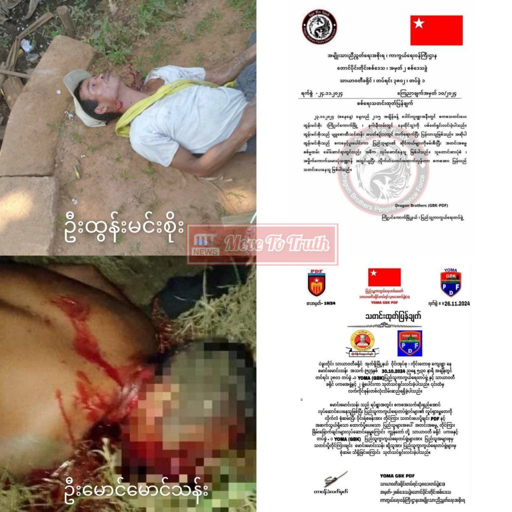 ထို့အတူ နိုဝင်ဘာ ၂၆ ရက် ရက်စွဲဖြင့် ကြို့ပင်ကောက် PDF အဖွဲ့၏ ဝန်ခံချက်အရ ပဲခူးတိုင်း၊ သာယာဝတီခရိုင်၊ အုတ်ဖိုမြို့နယ်၊ ဝိုင်းအုပ်စု ၊ ကိုင်းတောစုကျေးရွာနေ ဦးမောင်မောင်သန်း အသက် (၅၃)နှစ်ကို အောက်တိုဘာ ၃၀ ရက် ညနေ ၅ နာရီခွဲ အချိန်တွင် သာယာဝတီခရိုင် တပ်ရင်း ၃၈၀၁၊ တပ်ခွဲ -၁ YOMA (GBK)ပြည်သူကာကွယ်ရေးတပ်ဖွဲ့နှင့် သာယာဝတီခရိုင် ပကဖအဖွဲ့ ၂ ဖွဲ့ပေါင်းကာ သတ်ဖြတ်လိုက်ကြပြီး လက်ကိုင်ဖုန်းတစ်လုံးကိုပါ လုယက်သိမ်းယူခဲ့သည်ဟုလည်း သိရသည်။