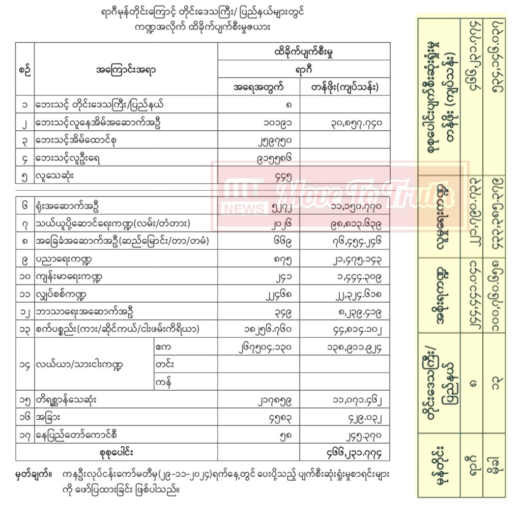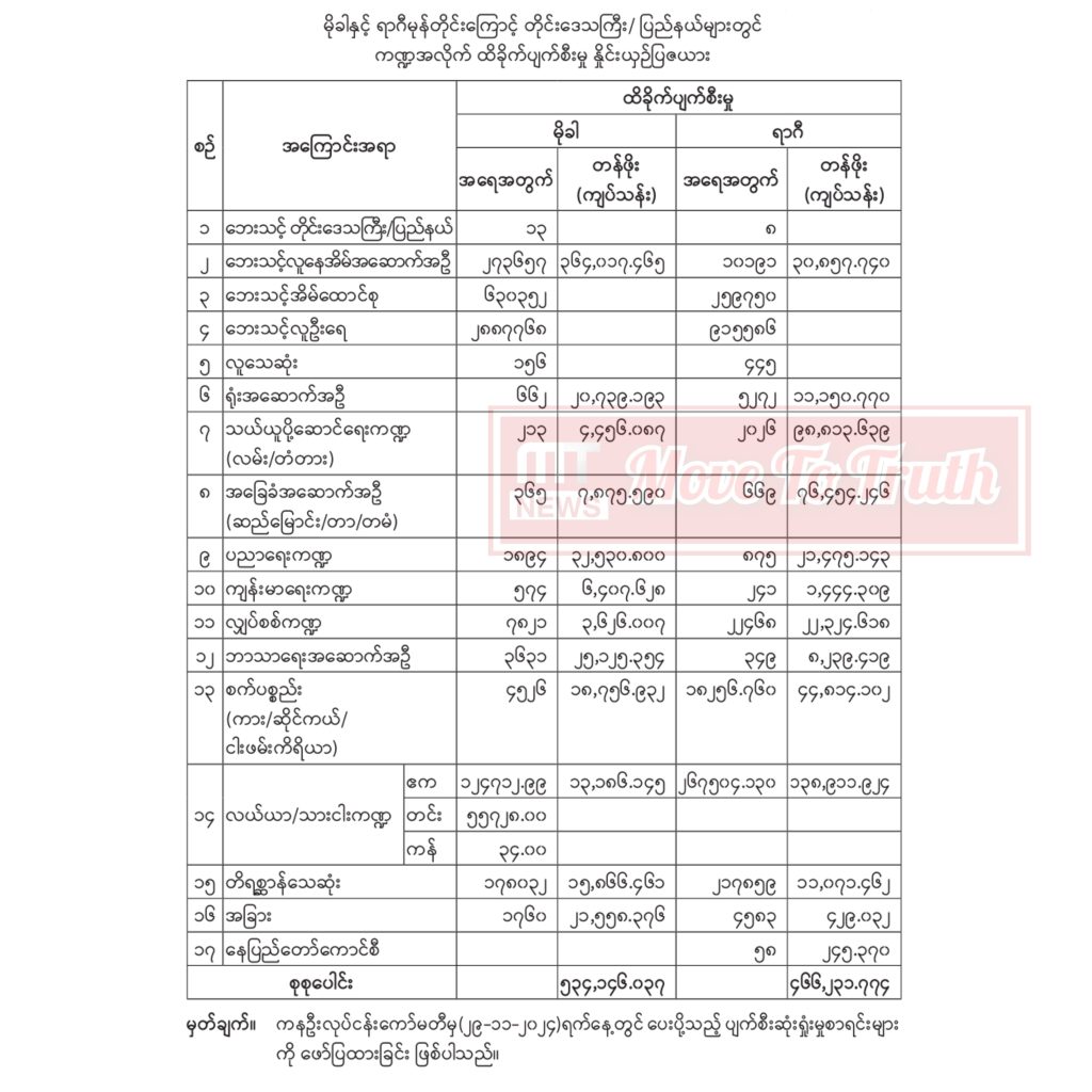 ၂၀၂၃ ခုနှစ်၊ မေလအတွင်း ဖြစ်ပွားခဲ့သော မိုခါမုန်တိုင်း၏ ပြင်းထန်သည့်အရှိန်ကြောင့် လေပြင်း တိုက်ခတ်ခြင်း၊ မိုးသည်းထန်စွာ ရွာသွန်းခြင်းများဖြစ်ပေါ်ခဲ့ရာ အစိုးရကဏ္ဍပျက်စီးဆုံးရှုံးမှု တန်ဖိုးငွေကျပ် ၁၀၀ ဘီလျံကျော်၊ လူမှုရေးကဏ္ဍဆုံးရှုံးမှု ငွေကျပ် ၄၃၃ ဘီလျံကျော်၊ စုစုပေါင်း ငွေကျပ် ၅၃၄ ဘီလျံကျော် ဆုံးရှုံးခဲ့ရသည်။ မိုခါမုန်တိုင်းသည် ရခိုင်ကမ်းရိုးတန်းသို့ ဦးတည်ဝင်ရောက်ခြင်းဖြစ်၍ ပျက်စီးဆုံးရှုံးမှုများ၏ ၉၈ ရာခိုင်နှုန်းခန့်မှာ ရခိုင်ပြည်နယ်တွင် ဖြစ်ပေါ်ခဲ့ခြင်းဖြစ်သည်။ ရာဂီမုန်တိုင်းကြောင့် ပျက်စီးဆုံးရှုံးမှုများအား နိုင်ငံတော်မှ ပံ့ပိုးကူညီပေးလျက်ရှိရာ ရေဘေးစတင် ဖြစ်ပွားသည်မှ ၂၀-၁၁-၂၀၂၄ ရက်အထိ ရေဘေးသင့်ပြည်သူများ တိုက်ရိုက်အကျိုးခံစားခွင့်ရရှိစေမည့် အရေးပေါ်စားနပ်ရိက္ခာများ ထောက်ပံ့မှုအတွက် ငွေကျပ် ၅ ဒသမ ၂၂၃ ဘီလီယံကျော်၊ သေဆုံးသွားသူများ၏ မိသားစုများအား ထောက်ပံ့မှုအတွက် ငွေကျပ် ၄၄၆ ဒသမ ၈၀၀ သန်းကျော်၊ နေအိမ်များပြန်လည်တည်ဆောက်ရန် ငွေကျပ် ၂၀ ဒသမ ၅၀၆ ဘီလျံကျော်၊ နေ့စဉ် အသက်မွေးဝမ်း ကျောင်းလုပ်ငန်းများဖြစ်သည့် စိုက်ပျိုးရေး၊ မွေးမြူရေးလုပ်ငန်းများအတွက် မျိုးစေ့၊ သွင်းအားစု၊ အိမ်မွေးနှင့် လယ်ယာသုံးတိရစ္ဆာန်များထောက်ပံ့မှု ငွေကျပ် ၄ ဒသမ ၇၃၂ ဘီလျံကျော် အပါအဝင် စုစုပေါင်းငွေကျပ် ၃၀ ဒသမ ၇၇၉ ဘီလျံကျော်ကို ထောက်ပံ့ထားပြီး ဖြစ်သည်။