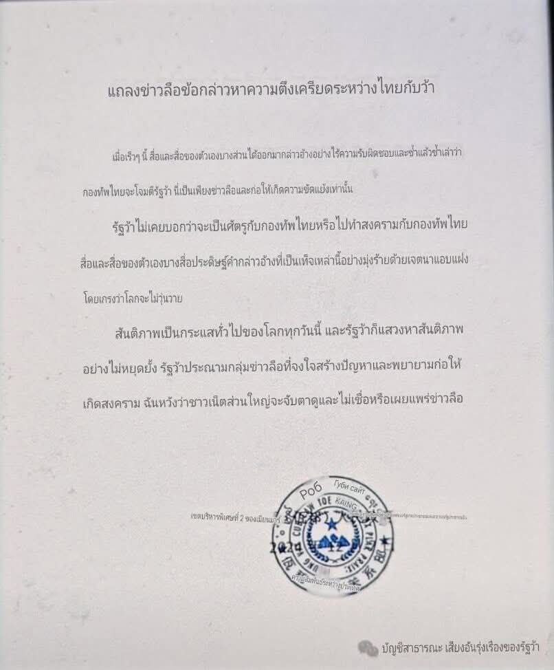 ထုတ်ပြန်ချက်မှာ “ဝ” တပ်ဟာ ထိုင်းစစ်တပ်ရဲ့ ရန်သူမဟုတ်သလို တိုက်ပွဲဖြစ်ပွားမယ့် စစ်ရေးသတင်းအမှားတွေကို မီဒီယာတွေက မဟုတ်မမှန်လုပ်ကြံ ရေးသားတဲ့အပေါ် အပြင်းအထန် ကန့်ကွက်ရှုတ်ချတယ်လို့ ဖော်ပြထားပါတယ်။
