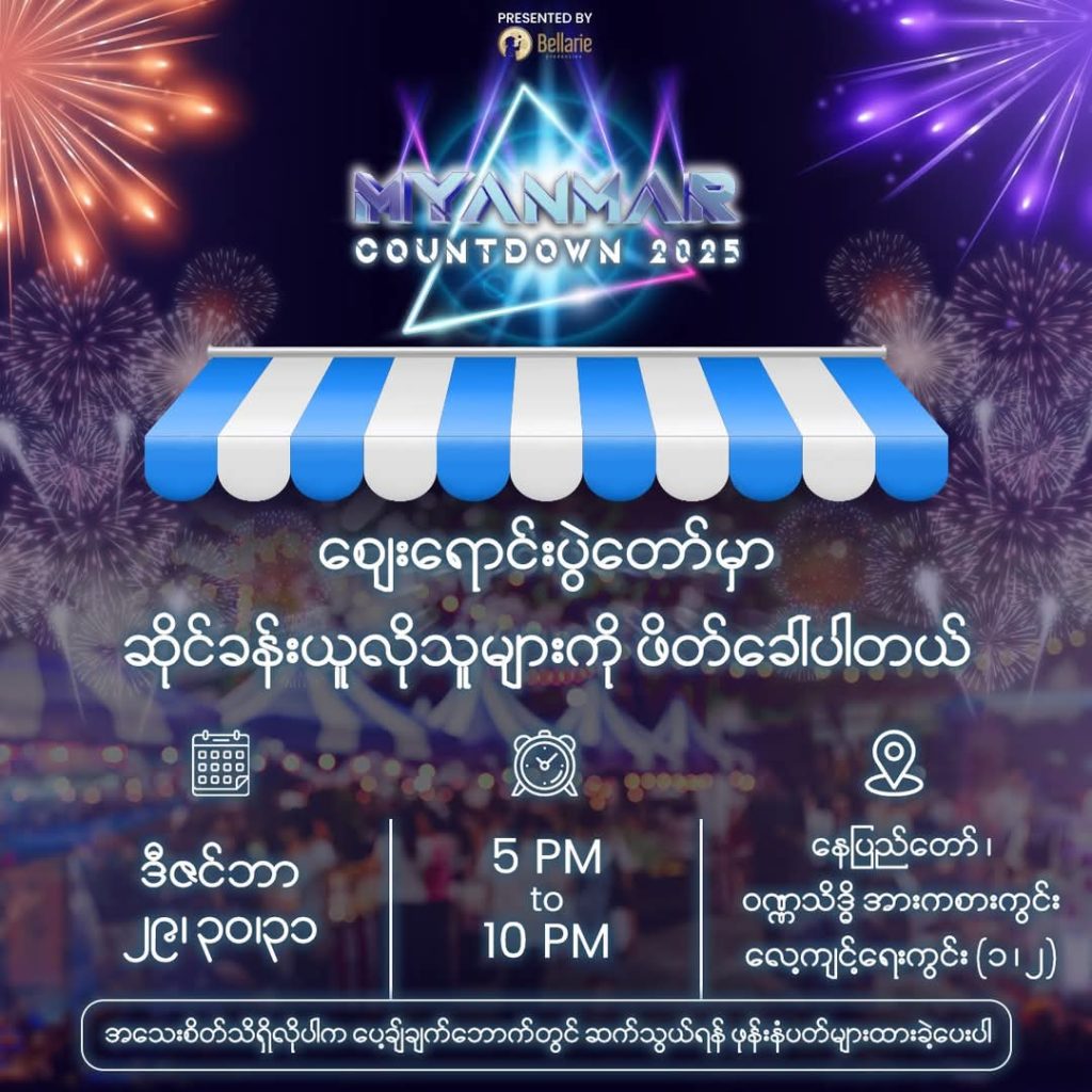 Myanmar Countdown ပွဲကြီး ကျင်းပပြုလုပ်မည့် ရက်များတွင် စျေးပွဲတော်လည်း ထည့်သွင်းကျင်းပရန် စီစဥ်နေပြီး အစားအသောက်များ၊ အဝတ်အထည်နှင့် လူသုံးကုန်ပစ္စည်းများ၊ Local Product များ၊ တိုင်းရင်းသား အစားအစာနှင့် ဒေသထွက် ပစ္စည်းများ၊ Handmade Product များ၊ အလှကုန်ပစ္စည်းများ အစရှိသဖြင့် ထည့်သွင်းကျင်းပမည်ဖြစ်သဖြင့် ရောင်းချလိုသော Vendor များလည်း Myanmar Countdown 2025 Page သို့ ဆက်သွယ်နိုင်ကြောင်း သိရသည်။