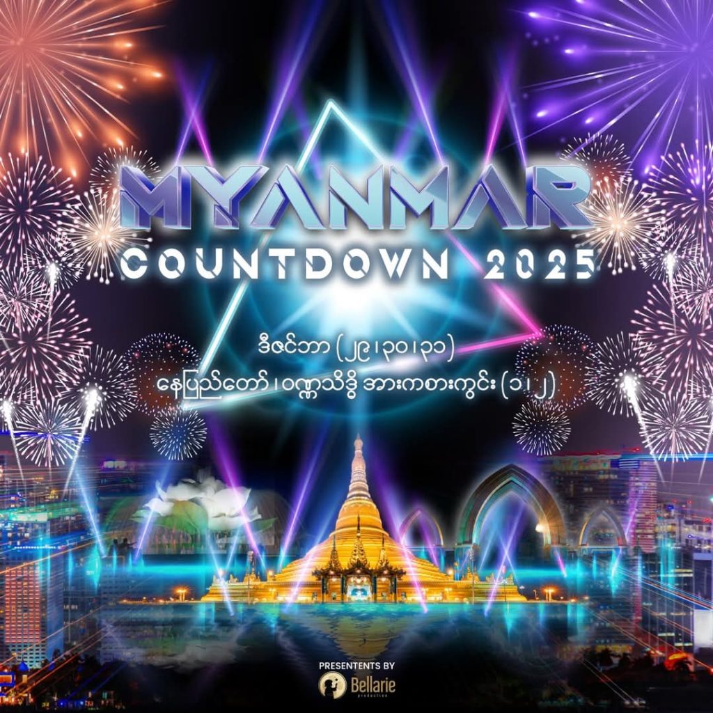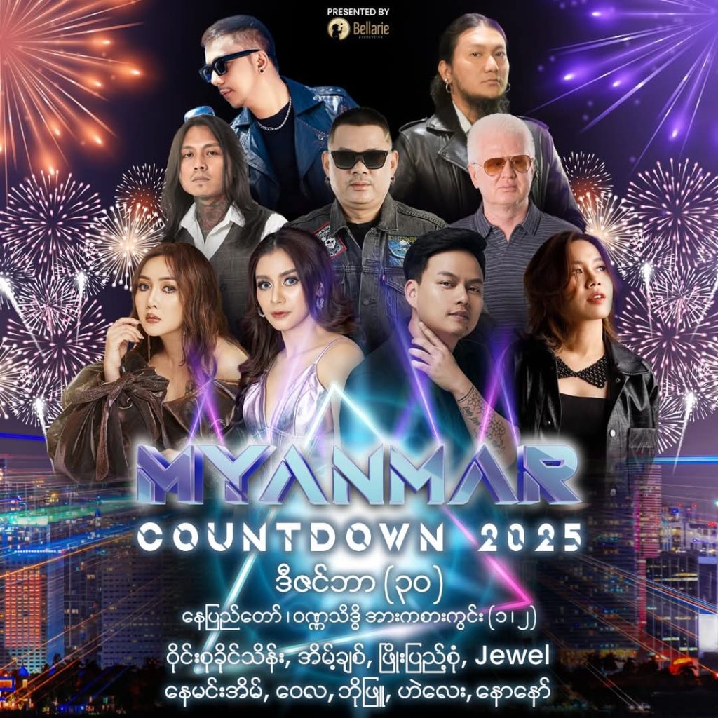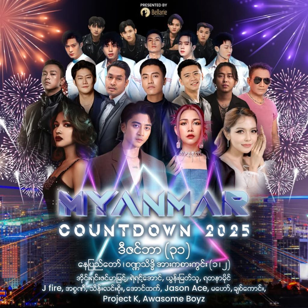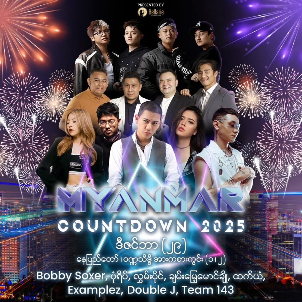 ၃ ရက်ကြာကျင်းပပြုလုပ်မည့် Myanmar Countdown 2025 ပွဲတော်ကြီး နိုင်ငံကျော်အဆိုတော်များဖြစ်သည့် Bobby Soxer ၊ ပုံရိပ်၊ လွှမ်းပိုင်၊ ချမ်းမြေ့မောင်ချို၊ ထက်ယံ၊ Examplez၊ Double J၊ Team 143၊ ဝိုင်းစုခိုင်သိန်း၊ ချစ်ကောင်း၊ အိမ့်ချစ်၊ ဖြိုးပြည့်စုံ၊ Jewel၊ နေမင်းအိမ်၊ ဝေလ၊ ဘိုဖြူ၊ ဟဲလေး၊ နောနော်၊ အိုင်းရင်းဇင်မာမြင့်၊ ရဲရင့်အောင်၊ ယွန်းမြတ်သူ၊ ရတနာမိုင်၊ J Fire၊ အစ္စဏီ၊ သိန်းလင်းစိုး၊ အောင်ထက်၊ Jason Ace၊ မဟော်၊ Project K၊ Awasome Boyz တို့ပါဝင်ဖျော်ဖြေသွားမည်ဖြစ်ကြောင်း သိရသည်။
