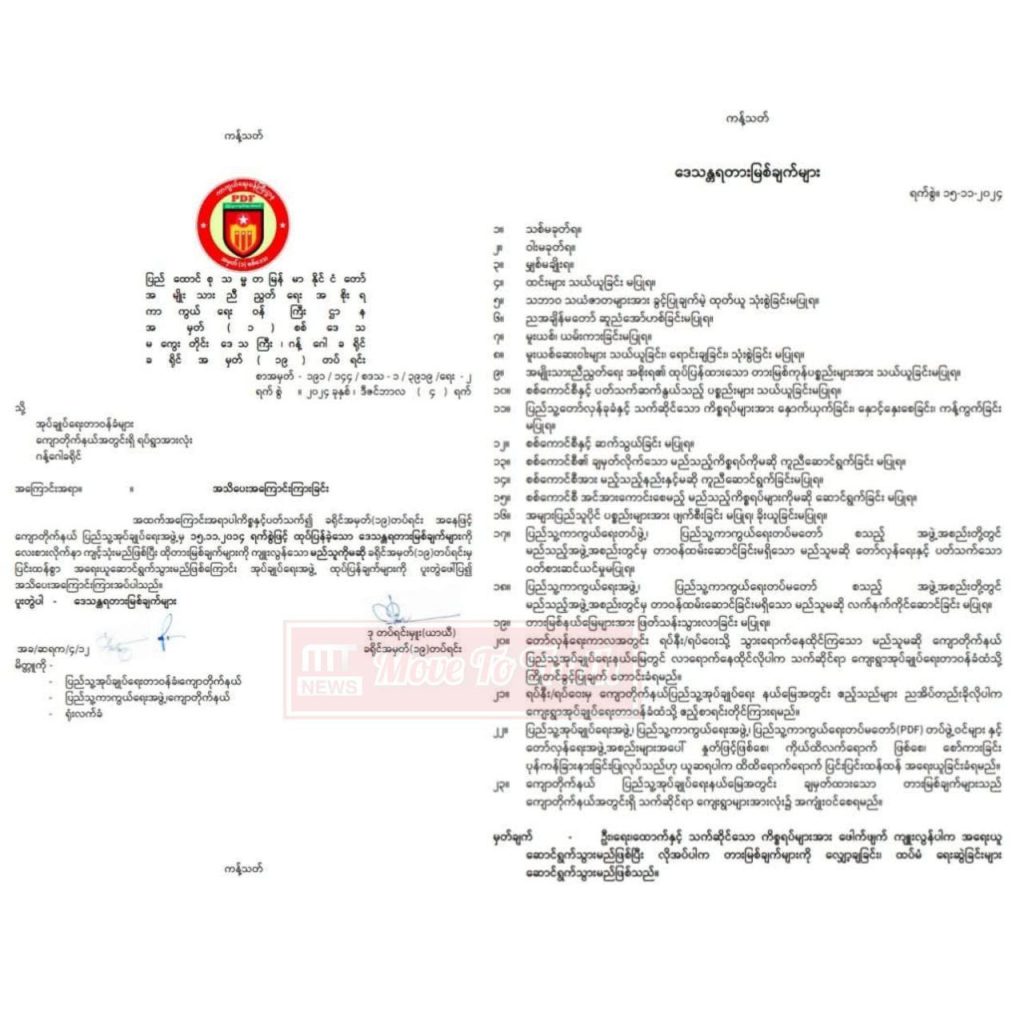 NUG ဩဇာခံ ကျောပအဖအဖွဲ့ဖြစ်တဲ့ ကြားကာလ ဒေသန္တရ ပြည်သူ့အုပ်ချုပ်ရေးဖော်ဆောင်မှု ဗဟိုကော်မတီ (ကျောတိုက်နယ်)ဟာ ဒေသန္တရ ဥပဒေမူကြမ်းတရပ်ရွေးဆွဲပြီး ဥပဒေနဲ့အညီ အုပ်ချုပ်စီမံခန့်ခွဲဖို့ ဒေသအတွင်း ခိုင်မာသော ပြတ်သားချက်တွေနဲ့ အရေးယူဆောင်ရွက်သွားမှာဖြစ်သလို ဒေသအတွင်း လိုအပ်ချက်များအတိုင်း ရေးဆွဲထားတာကိုလည်း ရာဇသတ်ကြီး ဥပဒေကျင့်ထုံးတွေနဲ့ ဆောင်ရွက်သွားမှာဖြစ်တဲ့အပြင် အဓိက တားမြစ်ချက်တွေကို (ခွင့်ပြုချက်မဲ့) ကျူးလွန်ကြောင်း ထင်ရှားရင် ပြင်းထန်စွာ အရေးယူဆောင်ရွက်သွားမယ့်အပြင် သေဒဏ်ထိ ချမှတ်နိုင်တဲ့ တရားစီရင်ခြင်းနဲ့ ဒေသန္တရ နည်းဥပဒေအတိုင်း မည်သူကိုမဆို အရေးယူဆောင်ရွက်သွားမှာလို့ အချက် ၂၃ ချက်ပါ တားမြစ်ချက်ကို နိုဝင်ဘာ ၁၅ ရက် ရက်စွဲနဲ့ ထုတ်ခဲ့တာပါ။