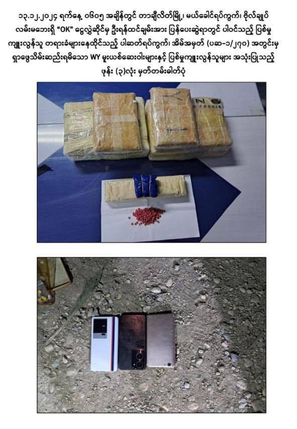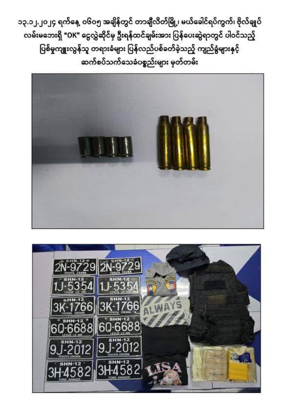 ထို့နောက် နေအိမ်အတွင်း ဆက်လက်ရှာဖွေရာ WY စိတ်ကြွရူးသွပ်ဆေးပြား (၆၅၀၀၀)ပြား၊ ကားနံပါတ် ပြား (၆) စုံ၊ အနက်ရောင် ကျည်ကာ (၂)ထည်၊ ရဲတပ်ဖွဲ့ အကျီတံဆိပ်ပါ ယူနီဖောင်း အကျီတစ်ထည်နှင့် မှုခင်းဖြစ်စဉ် အသုံးပြုခဲ့သည့် အဝတ်အစားများ၊ ၎င်းတို့ကိုင်ဆောင်သည့် ဖုန်း(၃)လုံးတို့ကို သိမ်းဆည်းရမိခဲ့သည်ဟု သိရှိရသည်။