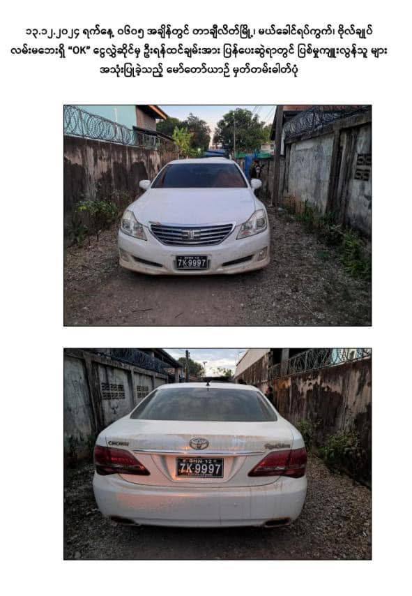 သံသယရှိသဖြင့် စုံစမ်းစစ်ဆေးမှု ပြုလုပ်နေသော ပါဆတ်ရပ်ကွက် ဆင်ဖြူမင်းလမ်းကြားရှိ အိမ်အမှတ် (၁/၂၇၀)တွင် ပြန်ပေးဆွဲရာ၌ အသုံးပြုသည့် ကားနှင့် သဏ္ဍန်တူသော Toyota Crown Royal Saloon (အဖြူရောင် ) ကို တွေ့ရှိရကြောင်း သတင်းရရှိရသဖြင့် ခရိုင်ရဲတပ်ဖွဲ့မှူးထံ သတင်းပေးပို့ခဲ့ရာ သက်ဆိုင်ရာ တာဝန်ခွဲဝေဆောင်ရွက်၍ တရားခံများ ခိုအောင်းနေထိုင်သည့် အဆိုပါနေအိမ်အား ဝင်ရောက်ရှာဖွေ စီးနင်းမှု ပြုလုပ်ခဲ့ကြောင်း သိရှိရသည်။