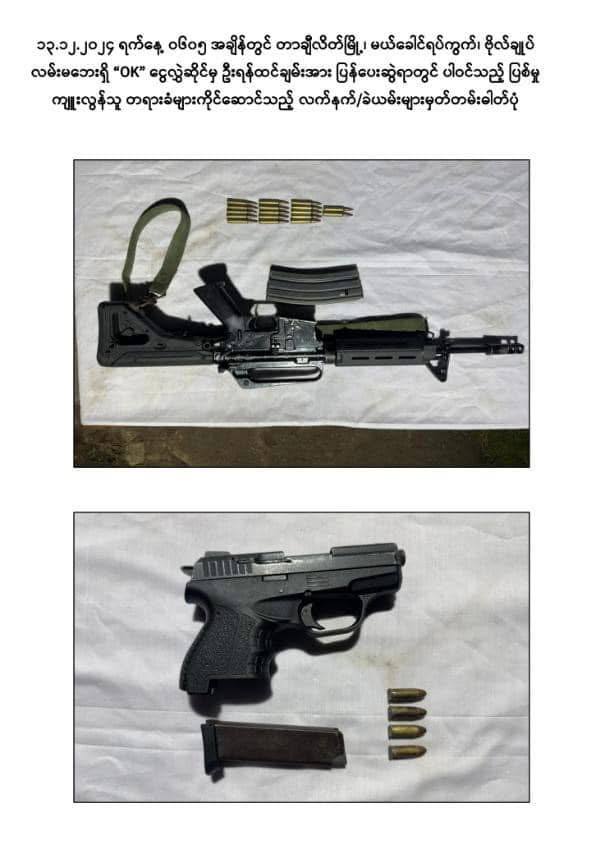 အပြန်အလှန် ပစ်ခတ်မှုကြောင့် အမည်မသိ သေဆုံးသူ တရားခံတစ်ဦး၏ လက်ထဲမှ M 16 သေနတ်အရှည် တစ်လက်၊ ကျည်အိမ် တစ်ခု၊ကျည် (၁၇)တောင့်၊ ကျည်ဆံခွံ (၁၄)ခုနှင့်အတူ ပွိုင့် ၃၈၀ အမျိုးအစား ပစ္စတိုသေနတ် အတိုတစ်လက်၊ ကျည်အိမ်တစ်ခု၊ ကျည် (၄)တောင့် ၊ ကျည်ခွံ (၄) ခုနှင့်အတူ အသေဖမ်းဆီးရမိခဲ့ သည်။