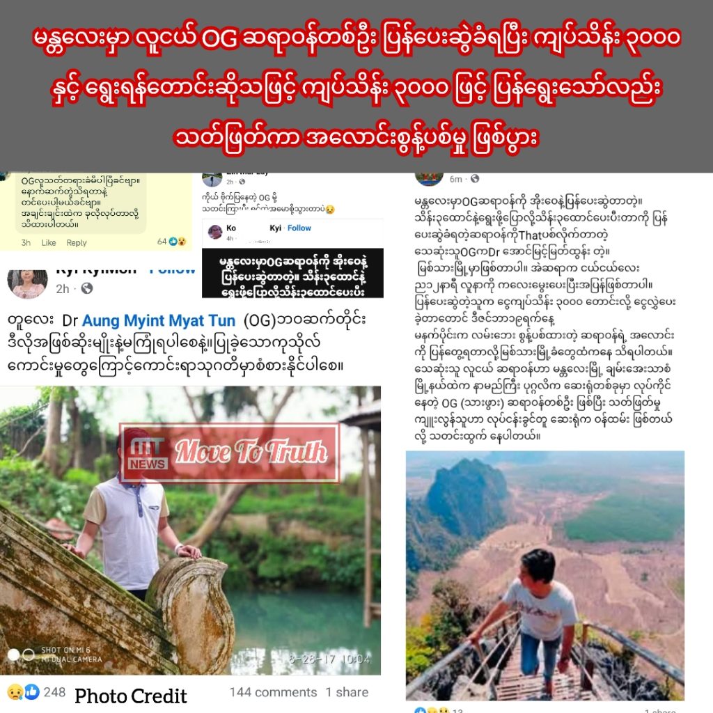 “Acc ထဲ က ဆရာဝန်အမတစ်ယောက်ရဲ့ အမျိုးသား (OG ဆရာဝန်ဟာ)ပြန်ပေးဆွဲခံရတယ်။ သိန်း ၃၀၀၀ နဲ့ ရွေးခိုင်းတာပေါ့။ ငွေလည်းပေးတယ်။ ရွေးလည်းရွေးပေမဲ့ နှိပ်စက်ပြီးသတ်တာခံရရှာတယ်။ အလောင်းကို မန္တလေးမြို့ကန်တော်ကြီးပတ်လမ်းရဲ့ တစ်နေရာမှာ ပြန်တွေ့ရတယ်လို့ ရဲသတင်းမှာတွေ့ရပြီ။ သတ်တဲ့သူကလည်း ဆရာဝန်ပဲ။ Same Batch ကပါပဲတဲ့။ အံဩစရာကောင်းတာက လူတွေရဲ့ အတွင်းစိတ်ပေါ့။ ရာထူးတွေ ပညာတွေ ရှိကြပေမဲ့ စာနာတဲ့ကရုဏာ စိတ်ထားရှိမှ ပညာဆိုတာလည်း လုပ်သင့်မလုပ်သင့်ကို ခွဲခြားနိုင်ပါမှ ဘယ်လောက်ပဲ မုန်းတီးနေနေ ဘာပြဿနာတွေရှိနေနေ ဉာဏ်သာလျှင်ရှေ့သွားပြီး တတ်နိုင်သမျှ စိတ်နှလုံးယဉ်ကျေးမှသာပါပဲ။ ဘယ်လိုပဲပြောပြော ကျူးလွန်သူက ကျူးလွန်၊ နစ်နာသူက နစ်နာသွားရပြီ ကျန်ရစ်သူကော ဖြစ်ရပ်ကိုရော ကြားရတာစိတ်မကောင်းဖြစ်ရပါတယ်”လို့ မိသားစုနဲ့ နီးစပ်ပြီး လူမှုကွန်ရက်မှာ လူသိများတဲ့အကောင့်တစ်ခုက ရေးသားဖော်ပြထားပါတယ်။