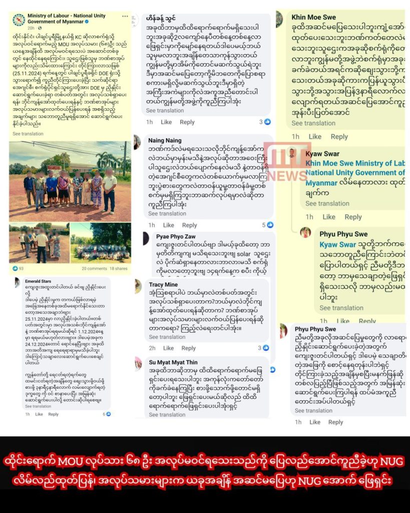 NUG ရဲ့ အလုပ်သမားဝန်ကြီးဌာန Page ဟာ မနေ့က ဒီဇင်ဘာ ၂၃ ရက်မှာ ထုတ်ပြန်ချက်တစ်ခုထုတ်ခဲ့ပြီး ဒီထုတ်ပြန်ချက်မှာ “ထိုင်းနိုင်ငံ၊ ပါချင်ပူရီမြို့နယ်ရှိ KC ဆိုလာစက်ရုံသို့ အလုပ်ဝင်ရောက်မည့် MOU အလုပ်သမား (၆၈)ဦး သည် ယနေ့အချိန်ထိ အလုပ်မဝင်ရသေးပဲ အဆောင်တစ်ခုတွင် နေထိုင်နေရကြောင်း၊ သူဌေးဖြစ်သူမှ ဘဏ်စာအုပ်များကိုလည်းသိမ်းထားကြောင်း တိုင်ကြားလာသဖြစ် (25.11.2024) ရက်နေ့တွင် ပါချင်ပူရီခရိုင် DOE ရုံးသို့သွားရောက်၍ ကူညီတိုင်ကြားပေးခဲ့ပြီး သက်ဆိုင်ရာအေဂျင်စီ၊ စက်ရုံပိုင်ရှင်သူဌေးတို့အား DOE မှ ညှိနှိုင်းဆောင်ရွက်ပေးခဲ့ရာ တစ်ပတ်အတွင်း အလုပ်သစ်ရှာပေးရန်၊ ဘိုင်ကျန့်အော်ထုတ်ပေးရန်နှင့် ဘဏ်စာအုပ်များအလုပ်သမားများလက်ဝယ်ပြန်ပေးရန် အစရှိသည့်အချက်များ သဘောတူညီမူရရှိအောင် ဆောင်ရွက်ပေးနိုင်ခဲ့ပါသည်(သတ်ပုံမူရင်း) လို့ ထုတ်ပြန်လာတာပါ။