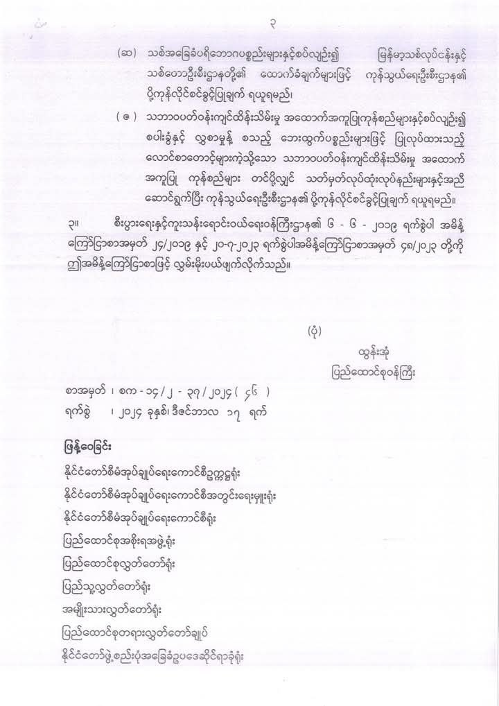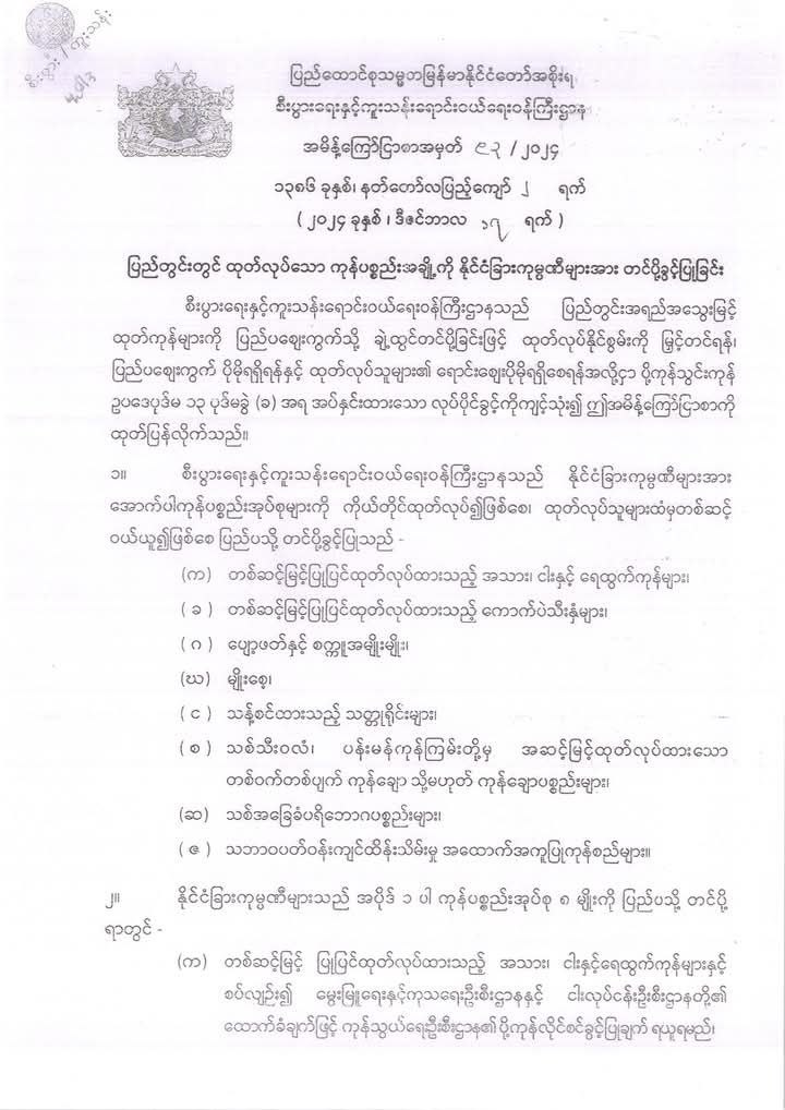 ပြည်တွင်းအရည်အသွေးမြင့် ထုတ်ကုန်များကို ပြည်ပဈေးကွက်သို့ ချဲ့ထွင်တင်ပို့ခြင်းဖြင့် ထုတ်လုပ်နိုင်စွမ်းကို မြှင့်တင်ရန်၊ ပြည်ပဈေးကွက် ပိုမိုရရှိရန်နှင့် ထုတ်လုပ်သူများ၏ ရောင်းဈေးပိုမိုရရှိစေရန်အလို့ငှာ ပို့ကုန်သွင်းကုန် ဥပဒေပုဒ်မ ၁၃ ပုဒ်မခွဲ (ခ) အရ အပ်နှင်းထားသော လုပ်ပိုင်ခွင့်ကိုကျင့်သုံး၍ ဤအမိန့်ကြော်ငြာစာကို ထုတ်ပြန်ကြောင်း သိရသည်။