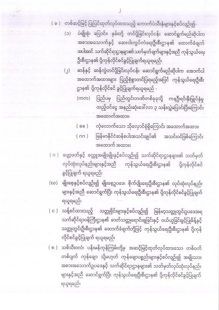 ပျော့ဖတ်နှင့် စက္ကူအမျိုးမျိုးတို့အတွက် သက်ဆိုင်ရာဌာနများ၏ သတ်မှတ် လုပ်ထုံးလုပ်နည်းများနှင့်အညီ ကုန်သွယ်ရေးဦးစီးဌာန၏ ပို့ကုန်လိုင်စင် ခွင့်ပြုချက် ရယူရမည်ဖြစ်သည်။ မျိုးစေ့နှင့်စပ်လျဉ်း၍ မျိုးစေ့ဥပဒေ၊ စိုက်ပျိုးရေးဦးစီးဌာန၏ လုပ်ထုံးလုပ်နည်းများနှင့်အညီ ဆောင်ရွက်ပြီး ကုန်သွယ်ရေးဦးစီးဌာန၏ ပို့ကုန်လိုင်စင်ခွင့်ပြုချက် ရယူရမည်ဖြစ်သည်။